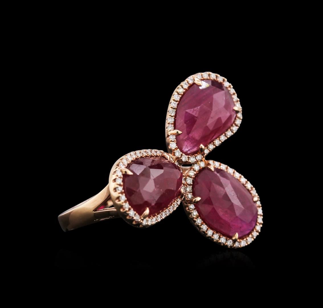 One ring featuring: 14KT rose gold weighing 8.42 grams containing three rubies with a total weight of 9.22ct and diamonds with a total weight of 0.40ct.