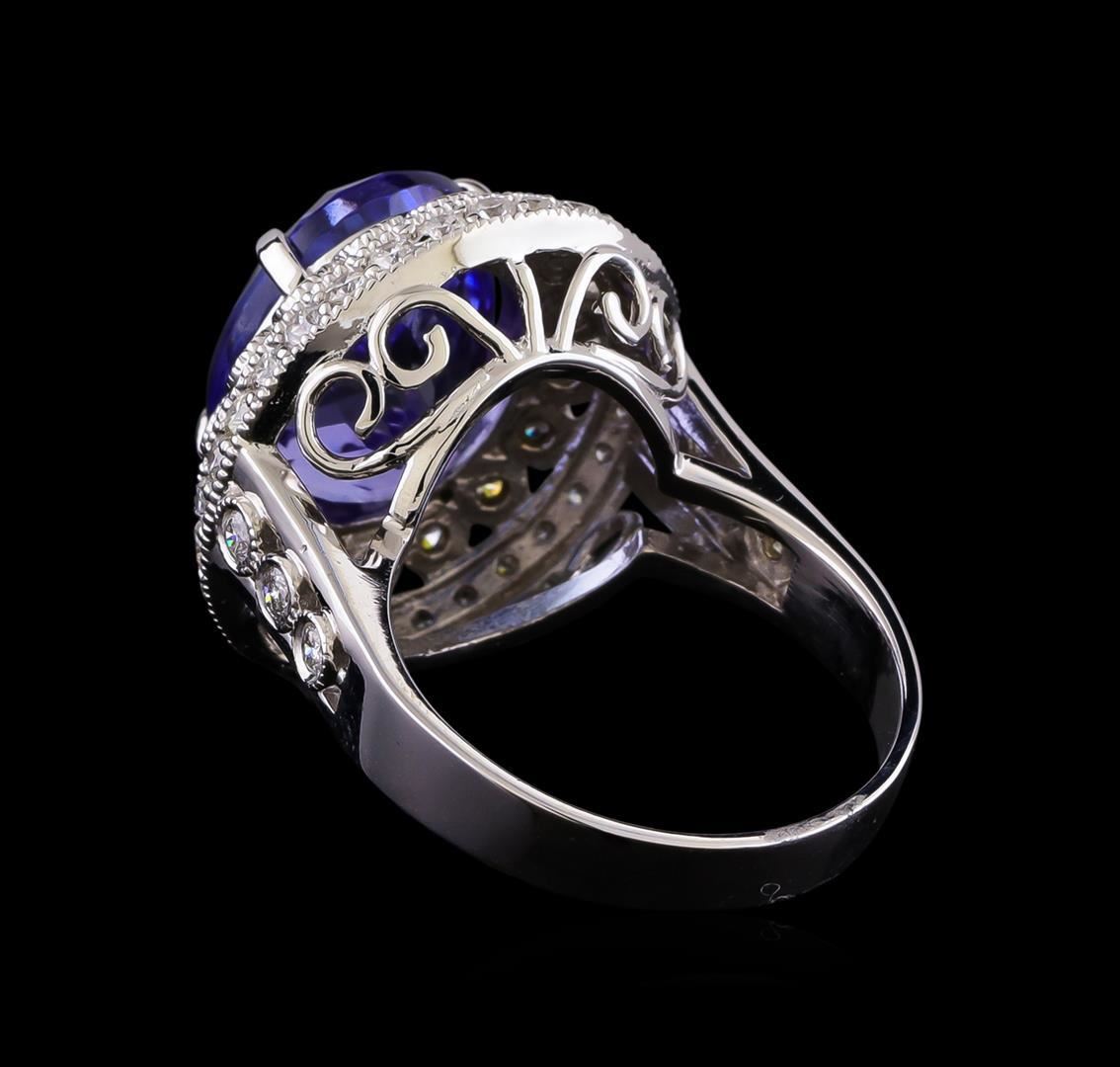 One electronically tested 14KT white gold lady's cast fashion ring with a double basket halo with a bright polish with milgrain detailing finish. The featured lady's has a shank measuring 3.11 millimeters in width. Identified with markings of "K14". Condition is new, good workmanship. Containing: One prong set oval modified brilliant cut natural tanzanite, measuring 13.15 x 10.74 x 9.02mm, (depth est.) approximate weight of 9.23ct., clarity is eye clean, medium light, moderately strong, violetish blue color, (GIA vB 4/4), cut is very good. Transmitting light with no distortion, transparent. Colored gemstones are presumed to have been subjected to commonly used enhancement processes. Graded in the setting. Twenty-Two bezel set round brilliant cut diamonds, measuring 1.95 - 1.90 x 1.20mm (depth est.) approximate total weight of 22 Stones = 0.60ct. Graded in the setting. Clarity: SI-1 to I-1. Color: H - I. Cut Good Thirty prong set round brilliant cut diamonds, measuring 1.85 - 1.75 x 1.12mm (depth est.) approximate total weight of 30 Stones = 0.67ct. Graded in the setting. Clarity: SI-1 to SI-2. Color: H - I. Cut Good. Total Weight of Colored Stones 9.23ct. Total Weight of Diamonds 1.27ct. Total Weight of Ring 9.60gm. GAS Appraised.