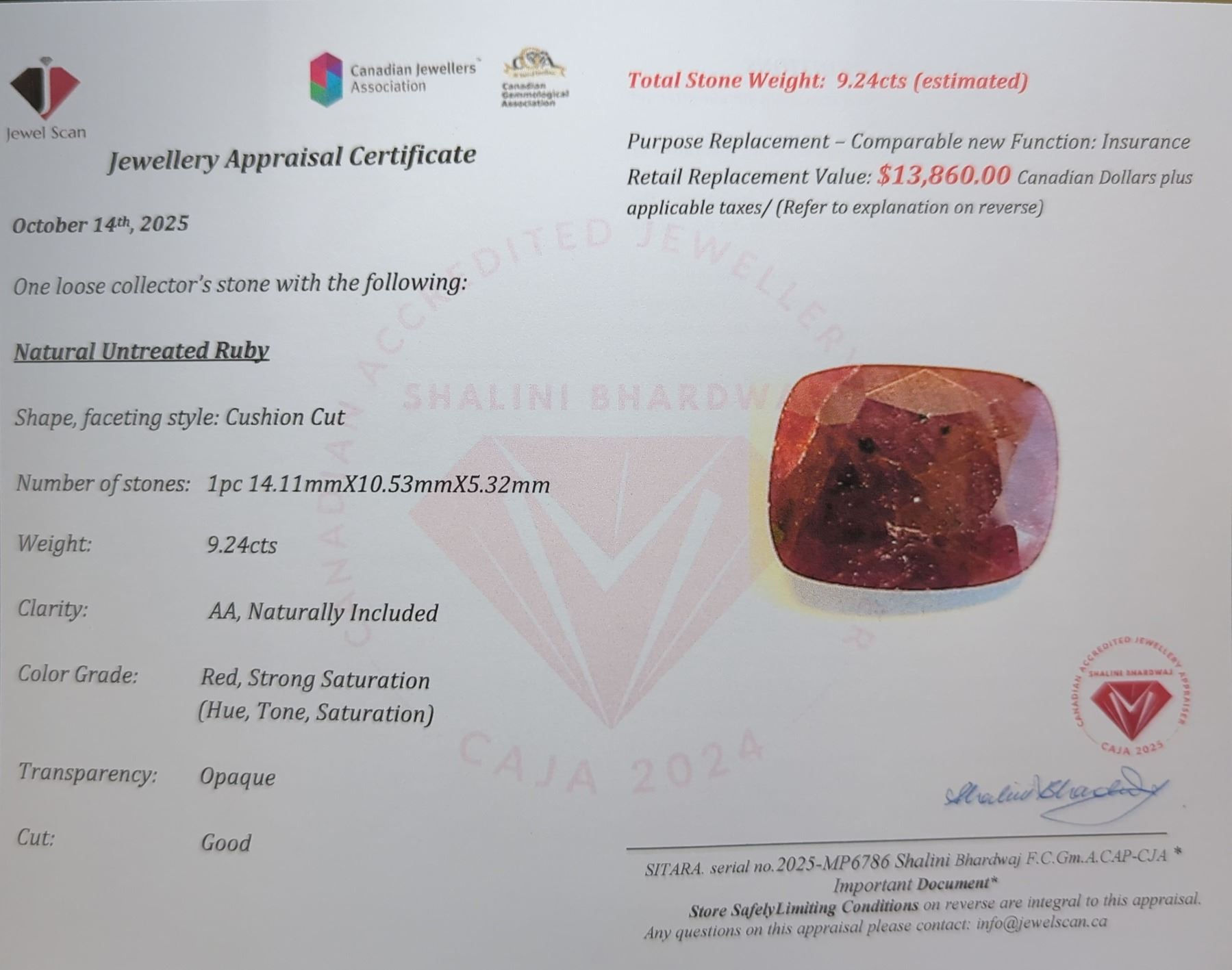9.24 ct Certified Untreated Ruby gemstone ($13,860 Appraisal)