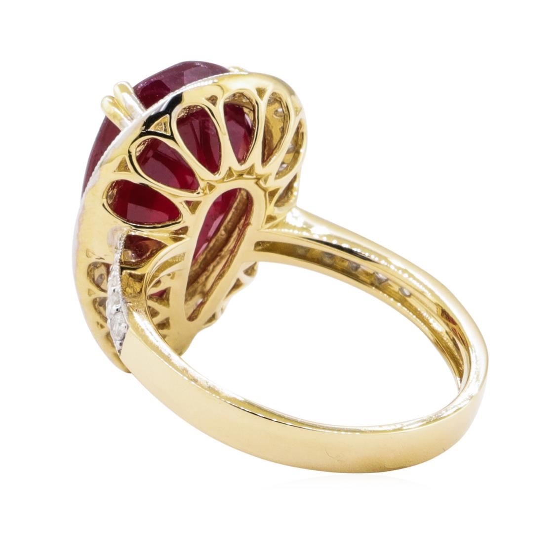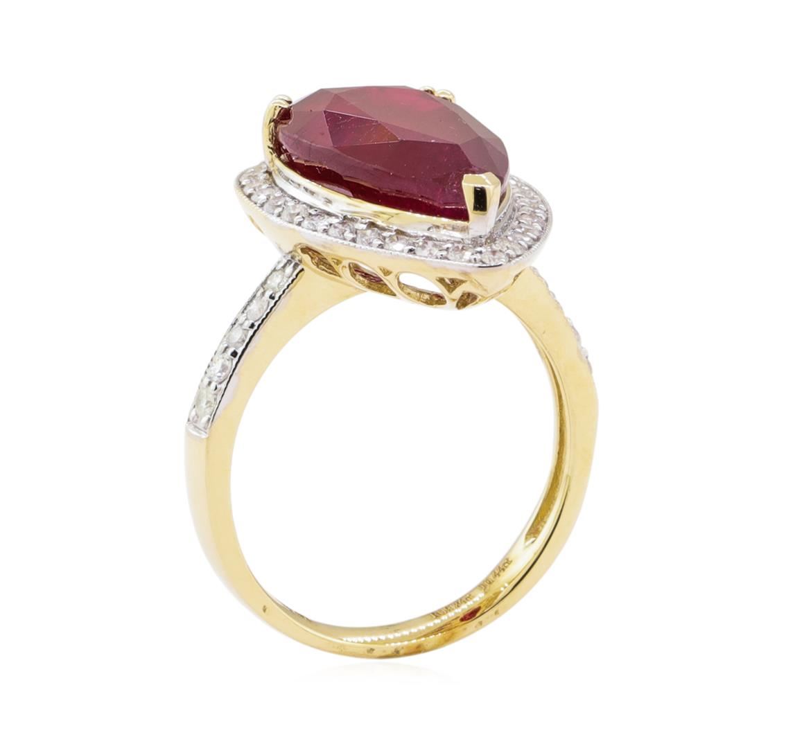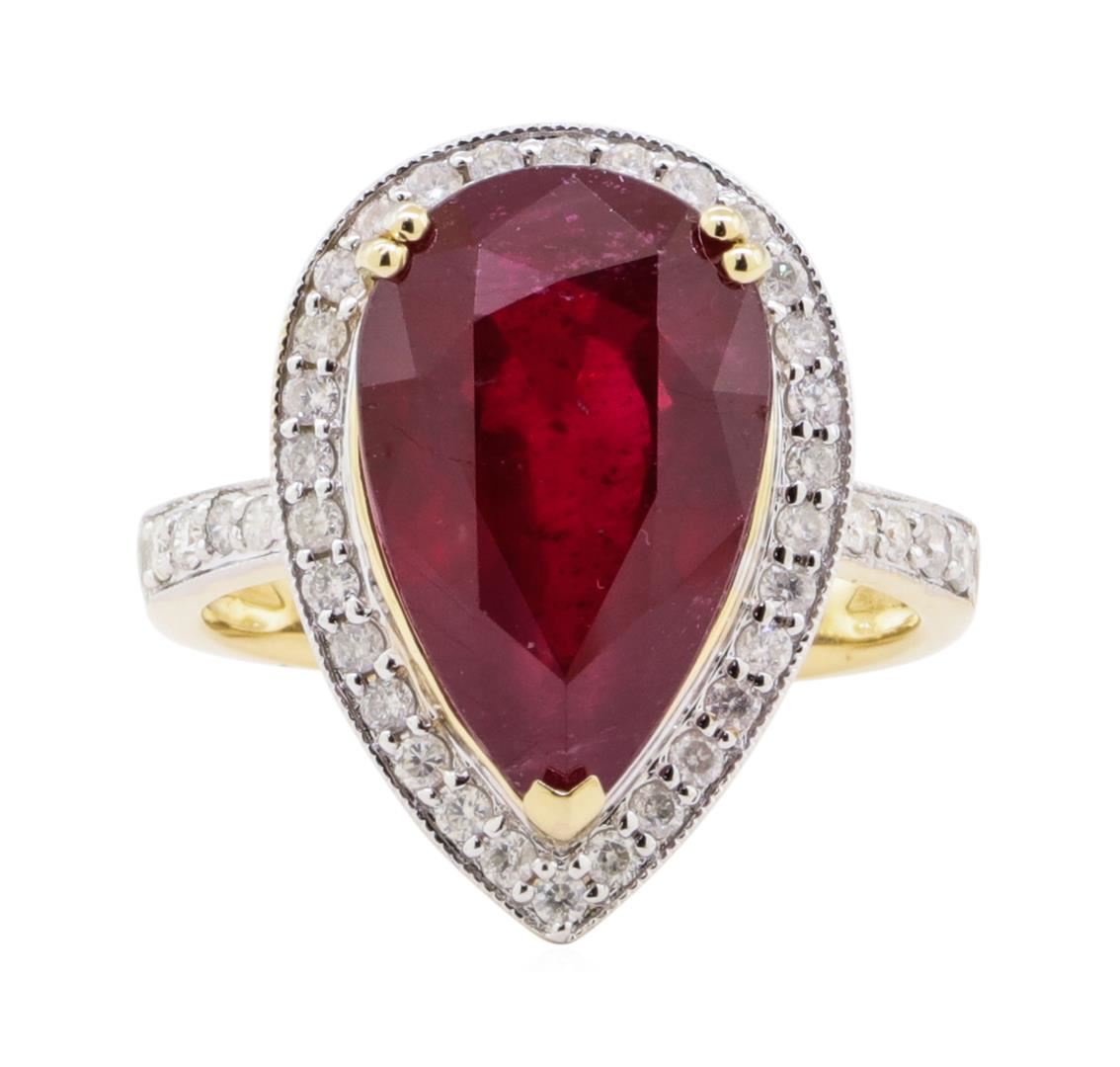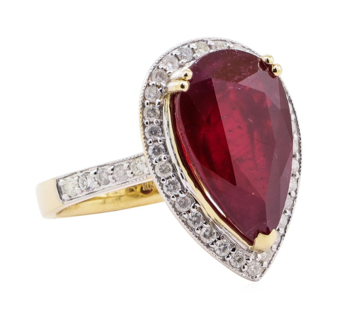 One electronically tested 14KT yellow gold ladies cast ruby & diamond ring. The featured ruby is set within a diamond bezel supported by an elaborate lattice under gallery and diamond set shoulders, completed by a two millimeter wide band. Bright polish finish with rhodium accents. Trademark is Orianne. Identified with markings of "14K". Condition is new, good workmanship. Containing: One prong set pear cut natural ruby, measuring 16.00 x 10.00 x 6.85mm, approximate weight of 9.24ct., clarity is heavily included, type II, medium dark, moderately strong, slightly purplish red color, (GIA slpR 6/4), cut is good. Transmitting light with a minimum of distortion, transparent. Naturally occurring internal & external characteristics are present. Indications of laboratory high temperature heat treatment, with glass & flux additives. Graded in the setting. Ruby has a low tolerance to rhodium plating, repolishing the surface, & ultrasonic cleaning. Forty bead set round brilliant cut diamonds, measuring 1.40 - 1.40 x 0.84mm (depth est.) approximate total weight of 40 Stones = 0.44ct. Graded in the setting. Clarity SI-2 to I-1 Color G - H Total Weight of Colored Stones 9.24 ct. Total Weight of Diamonds 0.44 ct. Total Weight of Ring 5.80 gm Estimated Retail Value $ 3,220.00 US