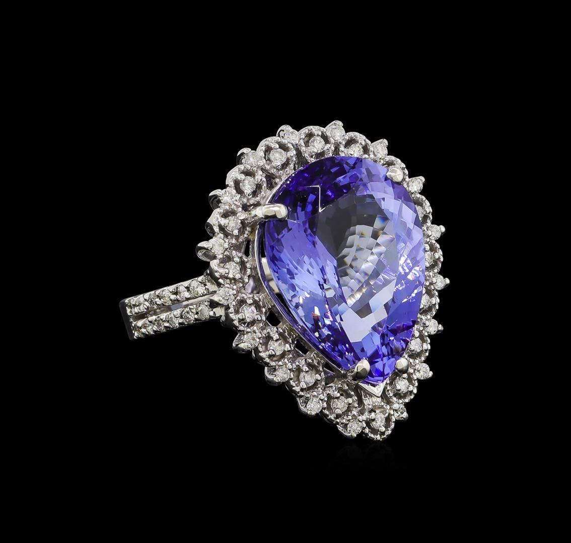 One electronically tested 14KT white gold lady's cast fashion ring with a split shank scalloped basket halo with a bright polish with milgrain detailing finish. The featured lady's ring has a shank measuring 2.89 millimeters wide. Identified with markings of 'K14'. Condition is new, good workmanship. Containing: One prong set pear modified brilliant cut natural tanzanite, measuring 16.26 x 12.25 x 6.99mm, (depth est.) approximate weight of 9.24ct., clarity is eye clean, medium, moderately strong, bluish violet color, (GIA bV 5/4), cut is very good. Transmitting light with no distortion, transparent. Colored gemstones are presumed to have been subjected to commonly used enhancement processes. Graded in the setting. Seventeen prong set round brilliant cut diamonds, measuring 1.40 - 1.30 x 0.84mm (depth est.) approximate total weight of 17 Stones = 0.16ct. Graded in the setting. Clarity SI-1 to I-1. Color: H - I Cut Good Forty-One prong set round brilliant cut diamonds, measuring 1.20 - 1.10 x 0.71mm (depth est.) approximate total weight of 41 Stones = 0.24ct. Graded in the setting. Clarity SI-1 to I-1. Color: H - I Cut Good. Total Weight of Colored Stones 9.24ct.. Total Weight of Diamonds 0.40ct.. Total Weight of Ring 7.40gm GAS Appraised at $16,595.00.