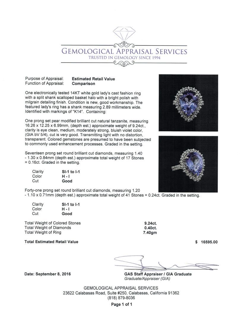 One electronically tested 14KT white gold lady's cast fashion ring with a split shank scalloped basket halo with a bright polish with milgrain detailing finish. The featured lady's ring has a shank measuring 2.89 millimeters wide. Identified with markings of 'K14'. Condition is new, good workmanship. Containing: One prong set pear modified brilliant cut natural tanzanite, measuring 16.26 x 12.25 x 6.99mm, (depth est.) approximate weight of 9.24ct., clarity is eye clean, medium, moderately strong, bluish violet color, (GIA bV 5/4), cut is very good. Transmitting light with no distortion, transparent. Colored gemstones are presumed to have been subjected to commonly used enhancement processes. Graded in the setting. Seventeen prong set round brilliant cut diamonds, measuring 1.40 - 1.30 x 0.84mm (depth est.) approximate total weight of 17 Stones = 0.16ct. Graded in the setting. Clarity SI-1 to I-1. Color: H - I Cut Good Forty-One prong set round brilliant cut diamonds, measuring 1.20 - 1.10 x 0.71mm (depth est.) approximate total weight of 41 Stones = 0.24ct. Graded in the setting. Clarity SI-1 to I-1. Color: H - I Cut Good. Total Weight of Colored Stones 9.24ct.. Total Weight of Diamonds 0.40ct.. Total Weight of Ring 7.40gm GAS Appraised at $16,595.00.