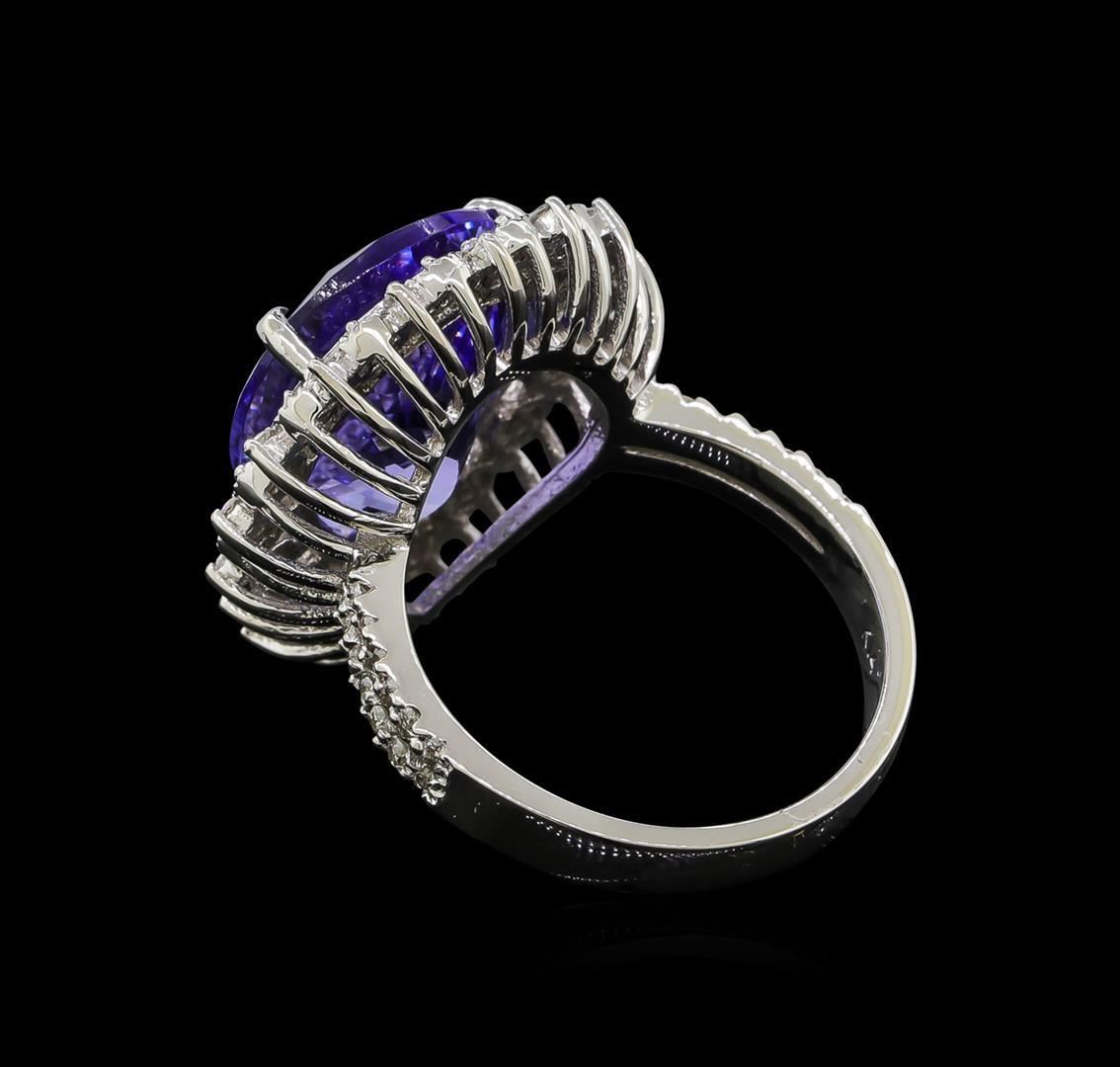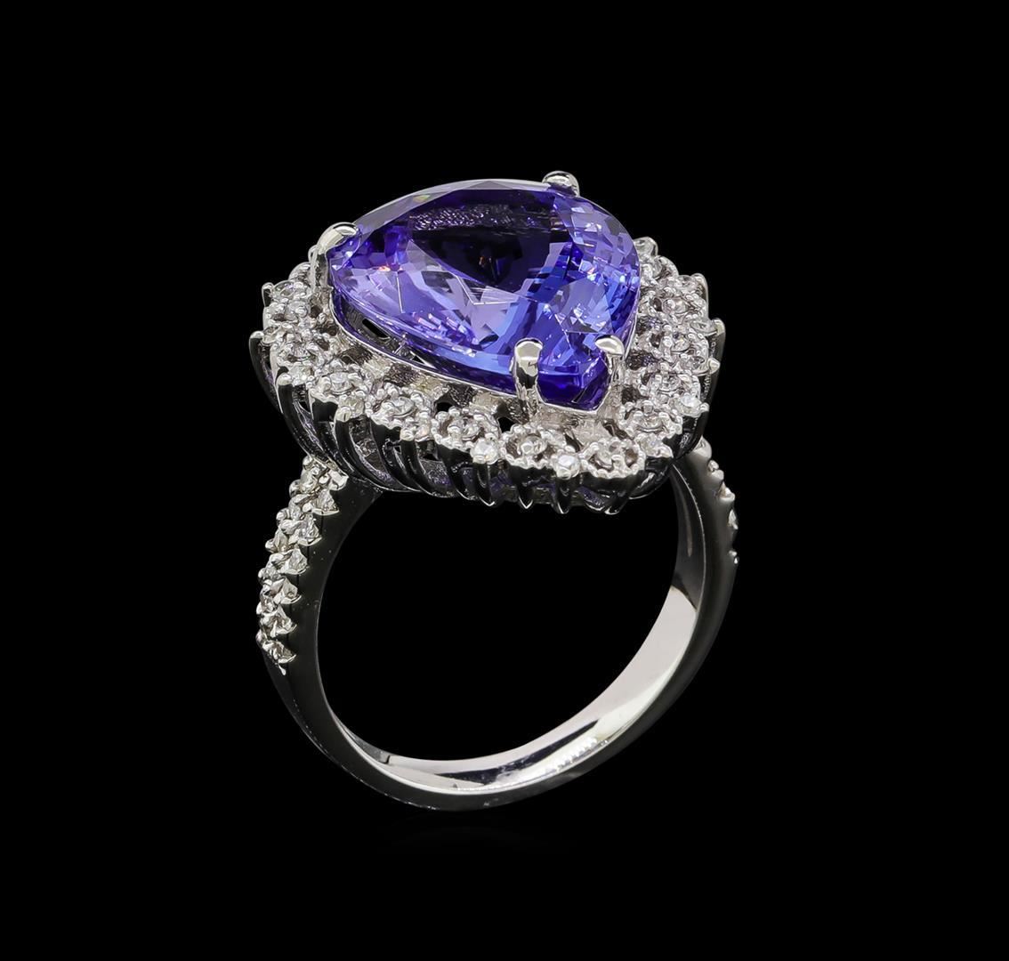 One electronically tested 14KT white gold lady's cast fashion ring with a split shank scalloped basket halo with a bright polish with milgrain detailing finish. The featured lady's ring has a shank measuring 2.89 millimeters wide. Identified with markings of 'K14'. Condition is new, good workmanship. Containing: One prong set pear modified brilliant cut natural tanzanite, measuring 16.26 x 12.25 x 6.99mm, (depth est.) approximate weight of 9.24ct., clarity is eye clean, medium, moderately strong, bluish violet color, (GIA bV 5/4), cut is very good. Transmitting light with no distortion, transparent. Colored gemstones are presumed to have been subjected to commonly used enhancement processes. Graded in the setting. Seventeen prong set round brilliant cut diamonds, measuring 1.40 - 1.30 x 0.84mm (depth est.) approximate total weight of 17 Stones = 0.16ct. Graded in the setting. Clarity SI-1 to I-1. Color: H - I Cut Good Forty-One prong set round brilliant cut diamonds, measuring 1.20 - 1.10 x 0.71mm (depth est.) approximate total weight of 41 Stones = 0.24ct. Graded in the setting. Clarity SI-1 to I-1. Color: H - I Cut Good. Total Weight of Colored Stones 9.24ct.. Total Weight of Diamonds 0.40ct.. Total Weight of Ring 7.40gm GAS Appraised.