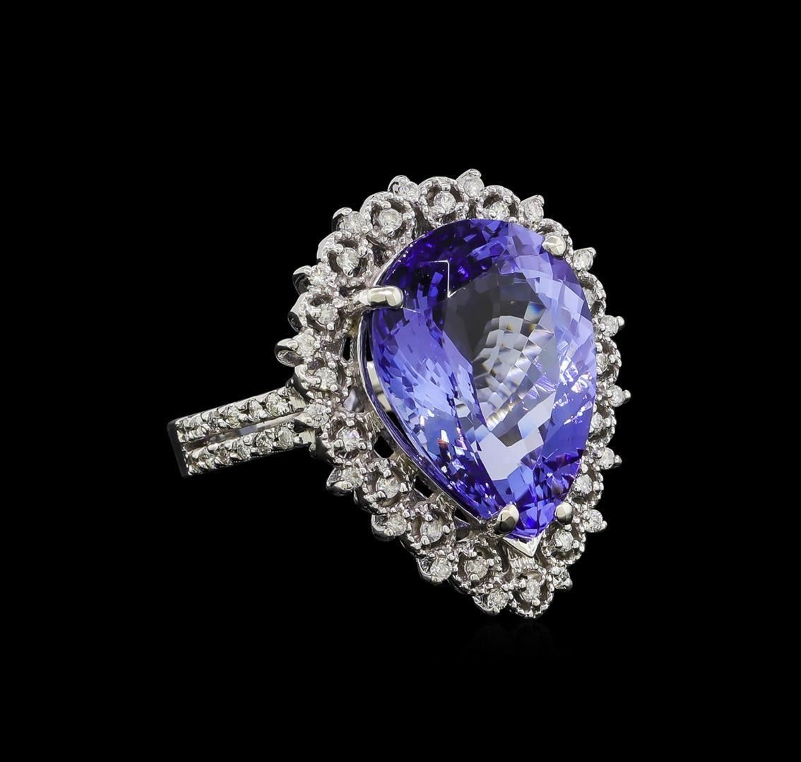 One electronically tested 14KT white gold lady's cast fashion ring with a split shank scalloped basket halo with a bright polish with milgrain detailing finish. The featured lady's ring has a shank measuring 2.89 millimeters wide. Identified with markings of 'K14'. Condition is new, good workmanship. Containing: One prong set pear modified brilliant cut natural tanzanite, measuring 16.26 x 12.25 x 6.99mm, (depth est.) approximate weight of 9.24ct., clarity is eye clean, medium, moderately strong, bluish violet color, (GIA bV 5/4), cut is very good. Transmitting light with no distortion, transparent. Colored gemstones are presumed to have been subjected to commonly used enhancement processes. Graded in the setting. Seventeen prong set round brilliant cut diamonds, measuring 1.40 - 1.30 x 0.84mm (depth est.) approximate total weight of 17 Stones = 0.16ct. Graded in the setting. Clarity SI-1 to I-1. Color: H - I Cut Good Forty-One prong set round brilliant cut diamonds, measuring 1.20 - 1.10 x 0.71mm (depth est.) approximate total weight of 41 Stones = 0.24ct. Graded in the setting. Clarity SI-1 to I-1. Color: H - I Cut Good. Total Weight of Colored Stones 9.24ct.. Total Weight of Diamonds 0.40ct.. Total Weight of Ring 7.40gm GAS Appraised.