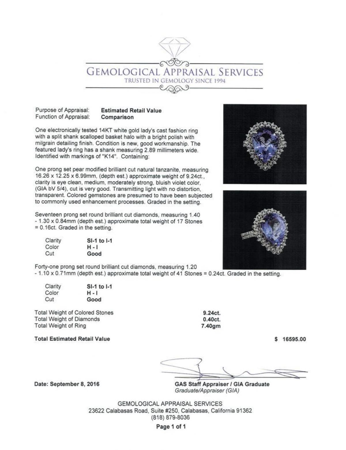 One electronically tested 14KT white gold lady's cast fashion ring with a split shank scalloped basket halo with a bright polish with milgrain detailing finish. The featured lady's ring has a shank measuring 2.89 millimeters wide. Identified with markings of 'K14'. Condition is new, good workmanship. Containing: One prong set pear modified brilliant cut natural tanzanite, measuring 16.26 x 12.25 x 6.99mm, (depth est.) approximate weight of 9.24ct., clarity is eye clean, medium, moderately strong, bluish violet color, (GIA bV 5/4), cut is very good. Transmitting light with no distortion, transparent. Colored gemstones are presumed to have been subjected to commonly used enhancement processes. Graded in the setting. Seventeen prong set round brilliant cut diamonds, measuring 1.40 - 1.30 x 0.84mm (depth est.) approximate total weight of 17 Stones = 0.16ct. Graded in the setting. Clarity SI-1 to I-1. Color: H - I Cut Good Forty-One prong set round brilliant cut diamonds, measuring 1.20 - 1.10 x 0.71mm (depth est.) approximate total weight of 41 Stones = 0.24ct. Graded in the setting. Clarity SI-1 to I-1. Color: H - I Cut Good. Total Weight of Colored Stones 9.24ct.. Total Weight of Diamonds 0.40ct.. Total Weight of Ring 7.40gm GAS Appraised.