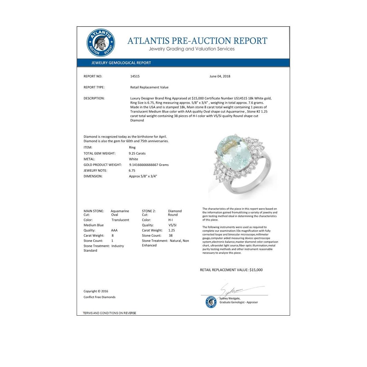 REF-209K5W -14515 ---- 9.25 CTW Aquamarine & Diamond Ring 18K White Gold ---- Luxury Designer Brand Ring Appraised at $15,000 Certificate Number US14515 18k White gold, Ring Size is 6.75, Ring measuring approx. 5/8" x 3/4" , weighing in total approx. 7.6 grams. Made in the USA and is stamped 18k, Main stone 8 carat total weight containing 1 pieces of Translucent Medium Blue color with AAA quality Oval shape cut Aquamarine , Stone #2 1.25 carat total weight containing 38 pieces of H-I color with VS/SI quality Round shape cut Diamond