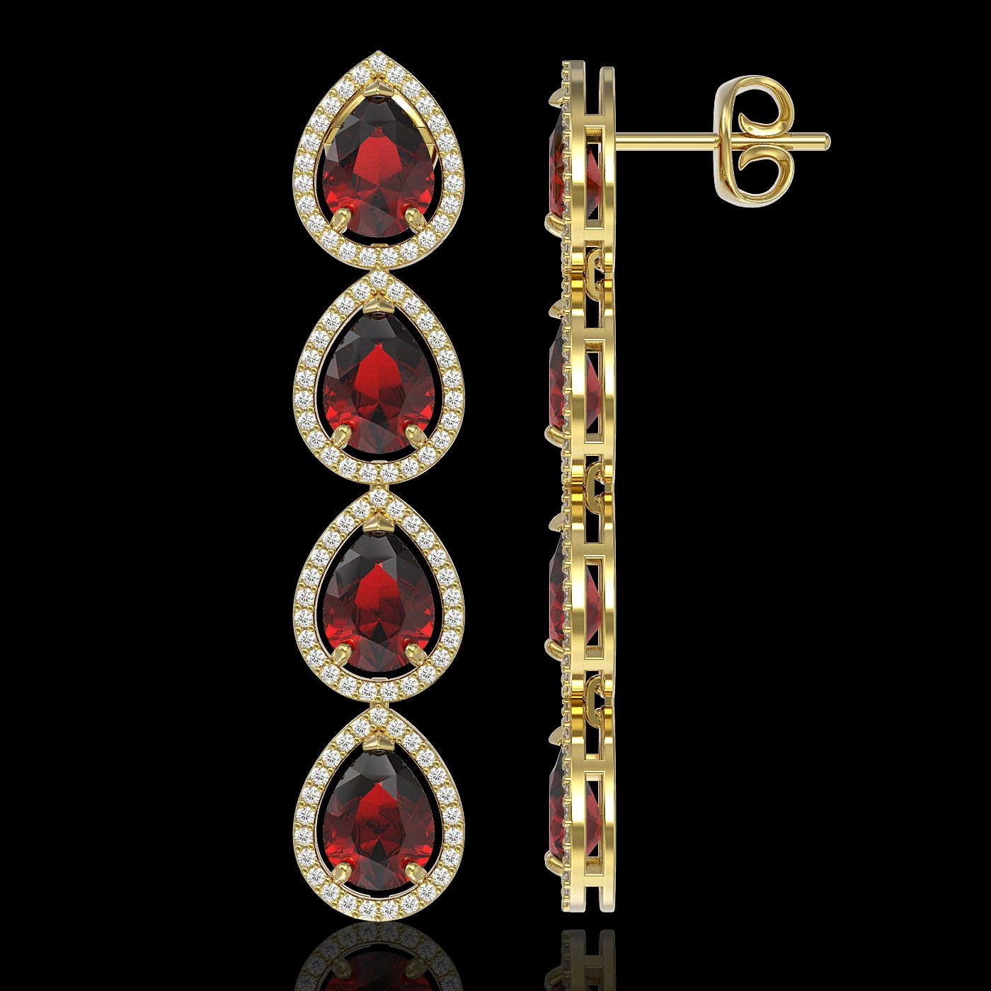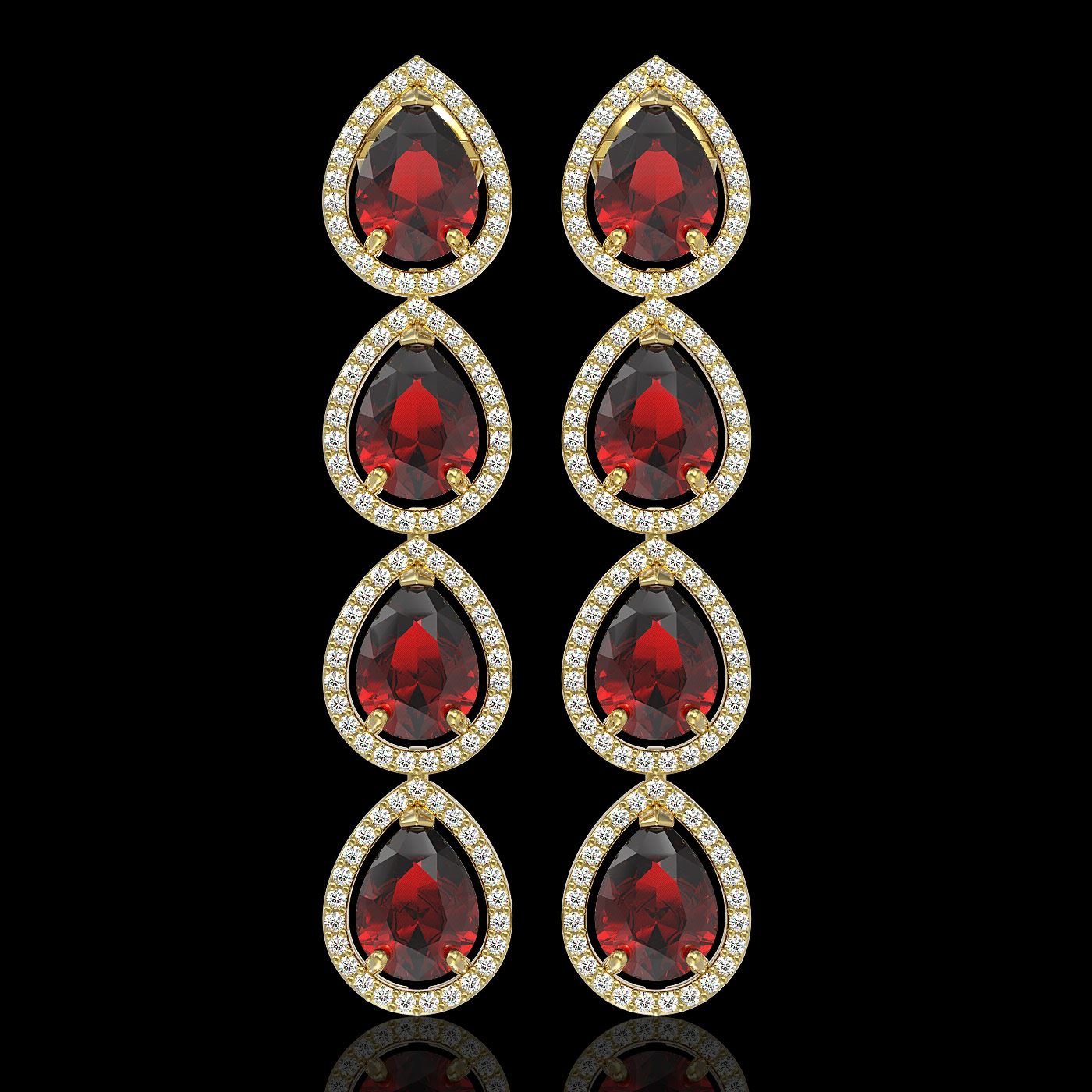 REF-151W3F -41329 ---- 9.25 CTW Garnet & Diamond Halo Earrings 10K Yellow Gold ---- Luxury Designer Brand Earring Appraised at $8,300 Certificate Number US41329 10k Yellow gold, Earring Size is 2 Inches Long, Earring measuring approx. 10 mm x 2 Inches, weighing in total approx. 8 grams. Made in the USA and is stamped 10k, Main stone 7.65 carat total weight containing 8 pieces of Saturated purplish Red color with AAA quality Pear shape cut Garnet , Stone #2 1.6 carat total weight containing 200 pieces of G-H color with VS/SI quality Round shape cut Diamond