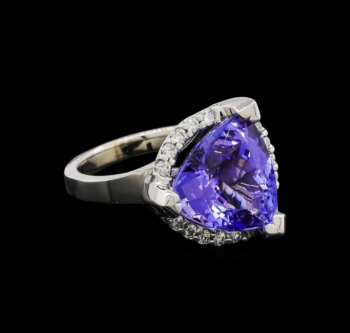 One electronically tested 14KT white gold lady's cast fashion ring with a cathedral halo with a bright polish finish. The featured lady's ring has a shank measuring 2.70 millimeters wide. Identified with markings of '14K'. Condition is new, good workmanship. Containing: One prong set triangle modified brilliant cut natural tanzanite, measuring 13.00 x 13.60 x 8.84mm, (depth est.) approximate weight of 9.25ct., clarity is eye clean, medium dark, moderately strong, violetish blue color, (GIA vB 6/4), cut is very good. Transmitting light with no distortion, transparent. Colored gemstones are presumed to have been subjected to commonly used enhancement processes. Graded in the setting. Fifteen prong set round brilliant cut diamonds, measuring 1.80 - 1.70 x 1.09mm (depth est.) approximate total weight of 15 Stones = 0.30ct. Graded in the setting. Clarity SI-1 to SI-2. Color: H - I Cut Good. Total Weight of Colored Stones 9.25ct.. Total Weight of Diamonds 0.30ct.. Total Weight of Ring 9.00gm GAS Appraised at $15,310.00.