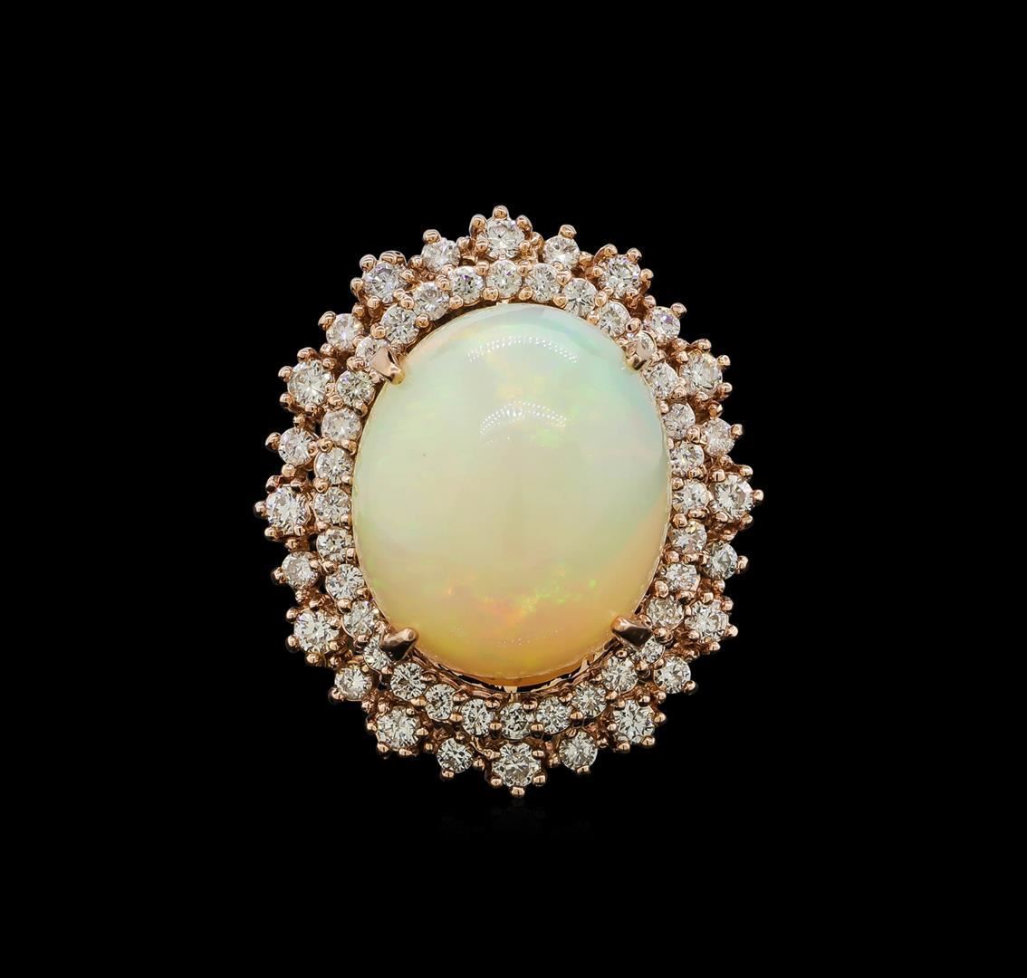 One electronically tested 14KT rose gold lady's cast fashion ring with a double basket halo with a bright polish finish. The featured lady's ring has a shank measuring 2.74 millimeters wide. Identified with markings of 'K14'. Condition is new, good workmanship. Containing: One crystal opal that is cut in a oval shaped cabochon and is prong set, measuring 16.80 mm long x 14.25 mm wide, and 10.46 mm thick and the approximate weight is 9.26 carats. The opal has a somewhat bright, green-orange play of color (fire) in a rolling flashfire pattern; a high dome; a good cut; no inclusions; slight variation in base in its brightness and pattern; and is not directional. Graded in the setting. Twelve prong set round brilliant cut diamonds, measuring 2.10 - 2.00 x 1.27mm (depth est.) approximate total weight of 12 Stones = 0.40ct. Graded in the setting. Clarity SI-1 to SI-2. Color: H - I Cut Good Forty-Four prong set round brilliant cut diamonds, measuring 1.80 - 1.65 x 1.04mm (depth est.) approximate total weight of 44 Stones = 0.81ct. Graded in the setting. Clarity SI-1 to I-1. Color: G - I Cut Good. Total Weight of Diamonds 1.21ct.. Total Weight of Opals 9.26ct.. Total Weight of Ring 10.50gm GAS Appraised.
