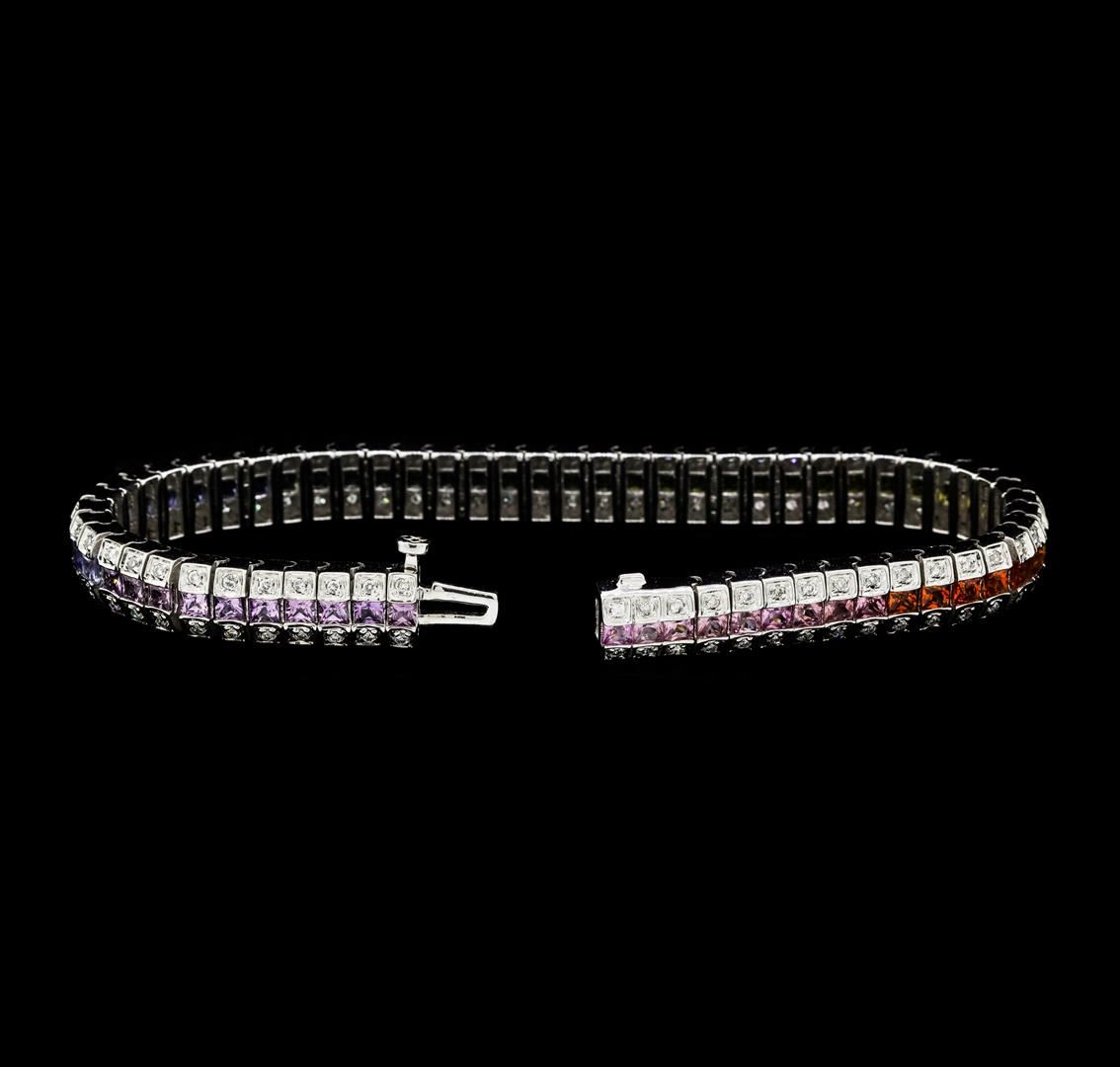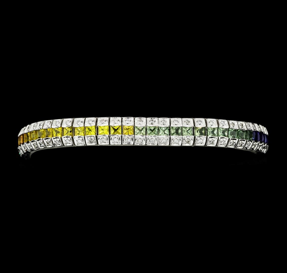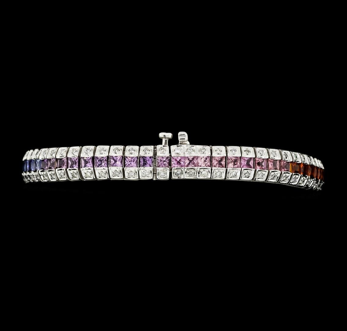 One electronically tested 14KT white gold lady's combination cast & assembled fashion bracelet with a tongue clasp with foldover safety with a bright polish finish. The featured lady's bracelet measures approximately 7 inches in length. Identified with markings of '14K'. Condition is new, good workmanship. Containing: Sixty-two channel set princess cut natural multi-color sapphires, measuring 2.50 x 2.40 x 1.56mm, (depth est.) approximate total weight of 8.01ct., clarity is slightly included, cut is very good. The featured sapphires range in color from pink to violetish pink to blue to green to yellow to orange. Transmitting light with no distortion, transparent. Colored gemstones are presumed to have been subjected to commonly used enhancement processes. Graded in the setting. One Hundred Twenty-Four prong set round brilliant cut diamonds, measuring 1.45 - 1.35 x 0.84mm (depth est.) approximate total weight of 124 Stones = 1.25ct. Graded in the setting. Color H - I Clarity SI-1 to I-1 Cut Good. Total Weight of Colored Stones 8.01ct.. Total Weight of Diamonds 1.25ct.. Total Weight of Bracelet 27.30gm GAS Appraised at $13585.00. GAS Appraised.