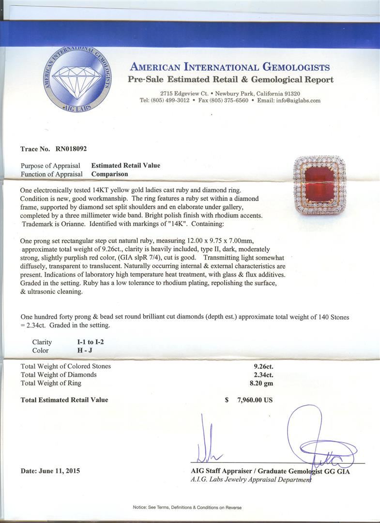 One electronically tested 14KT yellow gold ladies cast ruby and diamond ring. The ring features a ruby set within a diamond frame, supported by diamond set split shoulders and en elaborate under gallery, completed by a three millimeter wide band. Bright polish finish with rhodium accents. Trademark is Orianne. Identified with markings of "14K". Condition is new, good workmanship. Containing: One prong set rectangular step cut natural ruby, measuring 12.00 x 9.75 x 7.00mm, approximate total weight of 9.26ct., clarity is heavily included, type II, dark, moderately strong, slightly purplish red color, (GIA slpR 7/4), cut is good. Transmitting light somewhat diffusely, transparent to translucent. Naturally occurring internal & external characteristics are present. Indications of laboratory high temperature heat treatment, with glass & flux additives. Graded in the setting. Ruby has a low tolerance to rhodium plating, repolishing the surface,& ultrasonic cleaning. One Hundred Forty prong & bead set round brilliant cut diamonds (depth est.) approximate total weight of 140 Stones = 2.34ct. Graded in the setting. Clarity: I-1 to I-2. Color: H - J. Total Weight of Colored Stones 9.26ct. Total Weight of Diamonds 2.34ct. AIG Appraised at $7,960.00.