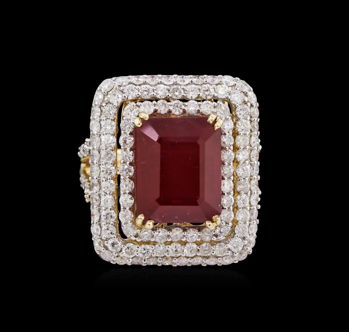 One electronically tested 14KT yellow gold ladies cast ruby and diamond ring. The ring features a ruby set within a diamond frame, supported by diamond set split shoulders and en elaborate under gallery, completed by a three millimeter wide band. Bright polish finish with rhodium accents. Trademark is Orianne. Identified with markings of "14K". Condition is new, good workmanship. Containing: One prong set rectangular step cut natural ruby, measuring 12.00 x 9.75 x 7.00mm, approximate total weight of 9.26ct., clarity is heavily included, type II, dark, moderately strong, slightly purplish red color, (GIA slpR 7/4), cut is good. Transmitting light somewhat diffusely, transparent to translucent. Naturally occurring internal & external characteristics are present. Indications of laboratory high temperature heat treatment, with glass & flux additives. Graded in the setting. Ruby has a low tolerance to rhodium plating, repolishing the surface,& ultrasonic cleaning. One Hundred Forty prong & bead set round brilliant cut diamonds (depth est.) approximate total weight of 140 Stones = 2.34ct. Graded in the setting. Clarity: I-1 to I-2. Color: H - J. Total Weight of Colored Stones 9.26ct. Total Weight of Diamonds 2.34ct. AIG Appraised at $7,960.00.
