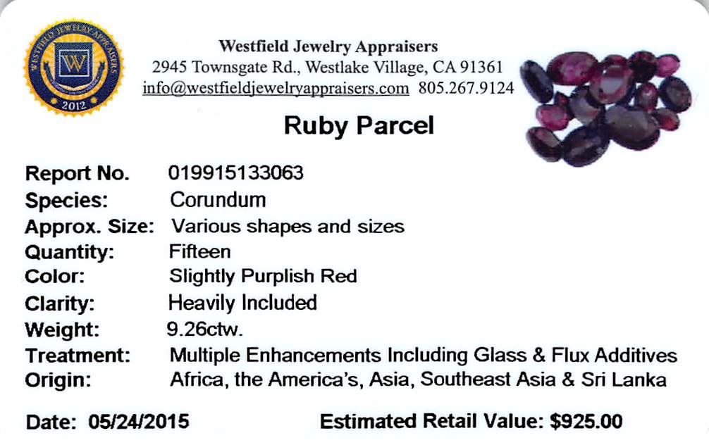 Fifteen various shapes & sizes cut natural rubies exact total weight 9.26ct., clarity is heavily included, type II, dark, very slightly brownish, slightly purplish red color, (GIA slpR 7/3), cut is good. Transmitting light somewhat diffusely, transparent to translucent. Naturally occurring internal & external characteristics are present. Indications of laboratory high temperature heat treatment, with glass & flux additives. Ruby has a low tolerance to rhodium plating, repolishing the surface, & ultrasonic cleaning. Westfield Appraised at $925.00.