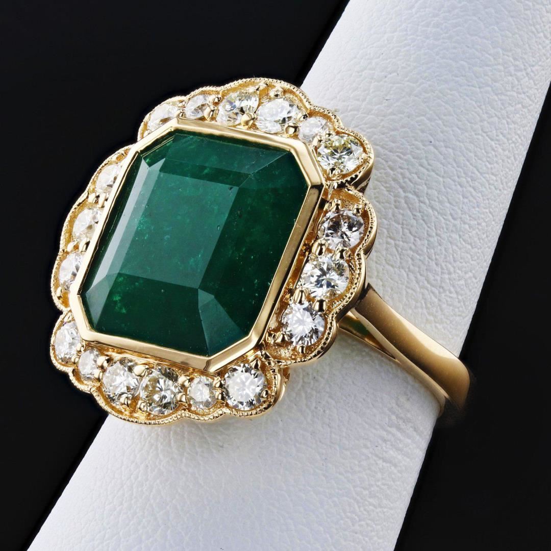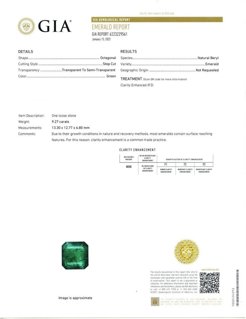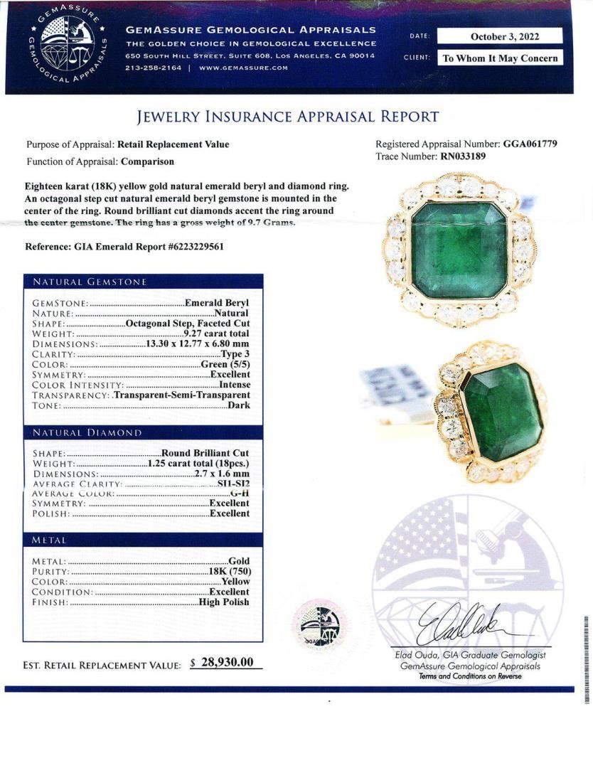 Eighteen karat (18K) yellow gold natural emerald beryl and diamond ring. An octagonal step cut natural emerald beryl gemstone is mounted in the center of the ring. Round brilliant cut diamonds accent the ring around the center gemstone. The ring has a gross weight of 9.7 Grams. Reference: GIA Emerald Report #6223229561 *NATURAL GEMSTONE* GEMSTONE: Emerald Beryl NATURE: Natural SHAPE: Octagonal Step, Faceted Cut WEIGHT: 9.27 carat total DIMENSIONS: 13.30 x 12.77 x 6.80mm CLARITY: Type 3 COLOR: Green (5/5) SYMMETRY: Excellent COLOR INTENSITY: Intense TRANSPARENCY: Transparent-Semi-Transparent TONE: Dark *NATURAL DIAMOND* SHAPE: Round Brilliant Cut WEIGHT: 1.25 carat total (18pcs.) DIMENSIONS: 2.7 x 1.6mm AVERAGE CIARITY: SI1-SI2 AVERAGE COLOR: G-H SYMMETRY: Excellent POLISH: Excellent *METAL* METAL: Gold PURITY: 18K (750) COLOR: Yellow CONDITION: Excellent FINISH: High Polish