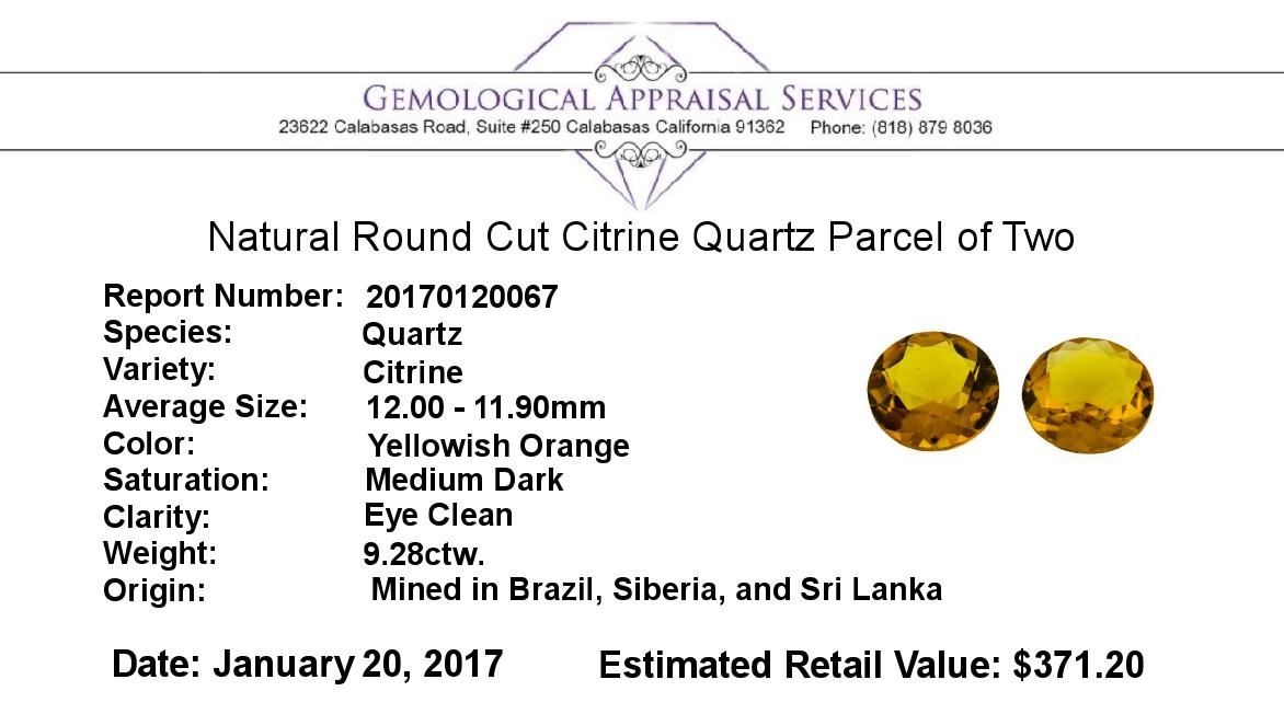 One natural round cut citrine quartz parcel of two with an exact weight of 9.28ctw., clarity is eye clean, yellowish orange, medium dark. Gemological Appraisals Services estimates the retail value at $371.2 GAS Appraised.