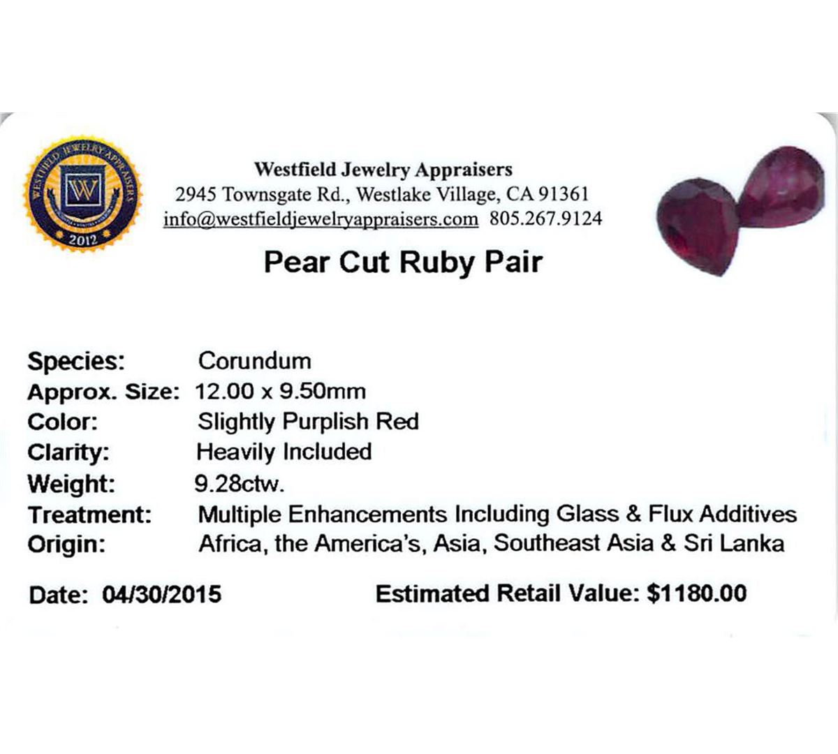 Two pear mixed cut natural rubies exact total weight 9.28ct., clarity is heavily included, type II, dark, very slightly brownish, slightly purplish red color, (GIA slpR 7/3), cut is good. Transmitting light somewhat diffusely, translucent. Naturally occurring internal & external characteristics are present. Indications of laboratory high temperature heat treatment, with glass & flux additives. Ruby has a low tolerance to rhodium plating, repolishing the surface, & ultrasonic cleaning. Westfield Appraised at $1,180.00.