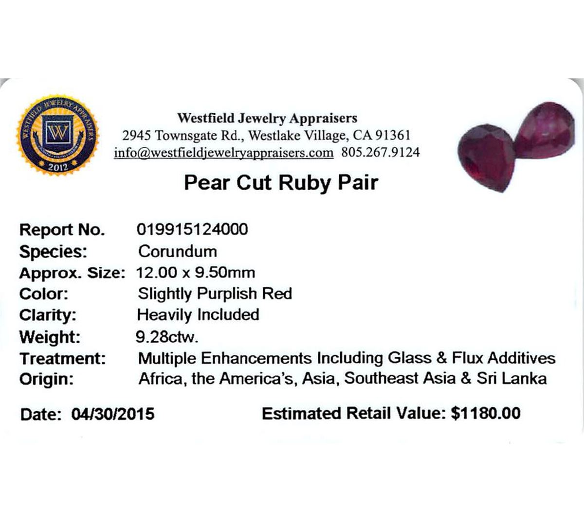 Two pear mixed cut natural rubies exact total weight 9.28ct., clarity is heavily included, type II, dark, very slightly brownish, slightly purplish red color, (GIA slpR 7/3), cut is good. Transmitting light somewhat diffusely, translucent. Naturally occurring internal & external characteristics are present. Indications of laboratory high temperature heat treatment, with glass & flux additives. Ruby has a low tolerance to rhodium plating, repolishing the surface, & ultrasonic cleaning. Westfield Appraised at $1,180.00.