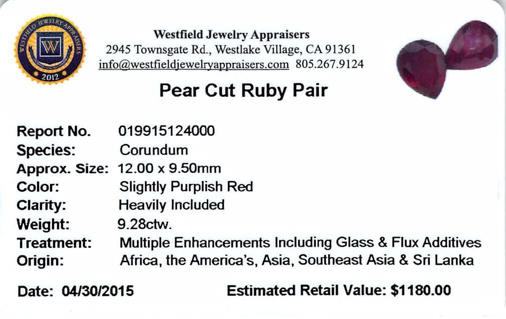 Two pear mixed cut natural rubies exact total weight 9.28ct., clarity is heavily included, type II, dark, very slightly brownish, slightly purplish red color, (GIA slpR 7/3), cut is good. Transmitting light somewhat diffusely, translucent. Naturally occurring internal & external characteristics are present. Indications of laboratory high temperature heat treatment, with glass & flux additives. Ruby has a low tolerance to rhodium plating, repolishing the surface, & ultrasonic cleaning. Westfield Appraised at $1,180.00.