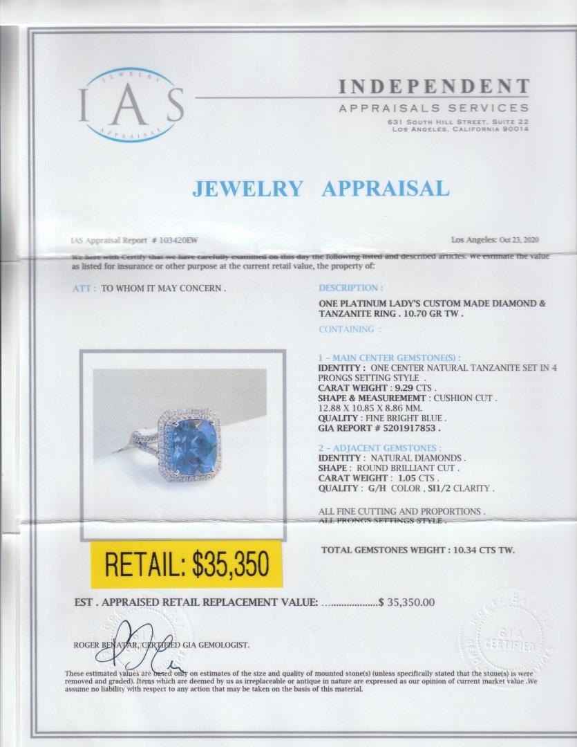 ONE PLATINUM LADY'S CUSTOM MADE DIAMOND and TANZANITE RING . 10.70 GR TW #1 - MAIN CENTER GEMSTONE(S):# IDENTITY: ONE CENTER NATURAL TANZANITE SET IN 4 PRONGS SETTING STYLE CARAT WEIGHT: 9.29 CTS SHAPE and MEASUREMEMT: CUSHION CUT, 12.88 X 10.85 X 8.86MM QUALITY: FINE BRIGHT BLUE GIA REPORT # 5201917853 #2 - ADJACENT GEMSTONES# IDENTITY: NATURAL DIAMONDS SHAPE: ROUND BRILLIANT CUT CARAT WEIGHT: 1.05 CTS QUALITY: G/H COLOR , SI1/2 CLARITY ALL FINE CUTTING AND PROPORTIONS TOTAL GEMSTONES WEIGHT: 10.34 CTS TW. Size: 7