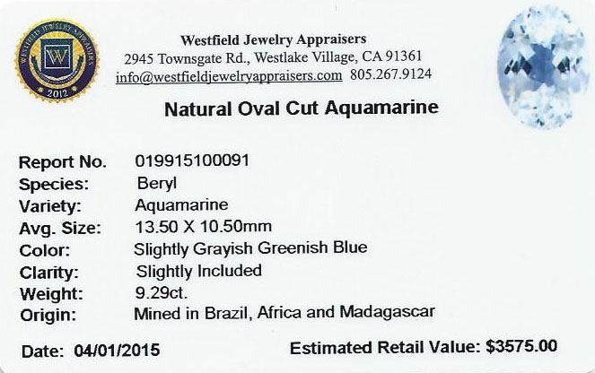 One oval cut natural aquamarine exact weight 9.29ct., clarity is slightly included, type I, medium light, very slightly grayish, very slightly greenish blue color, (GIA vslgB 4/3), cut is good. Westfield Appraised at $3,575.00.