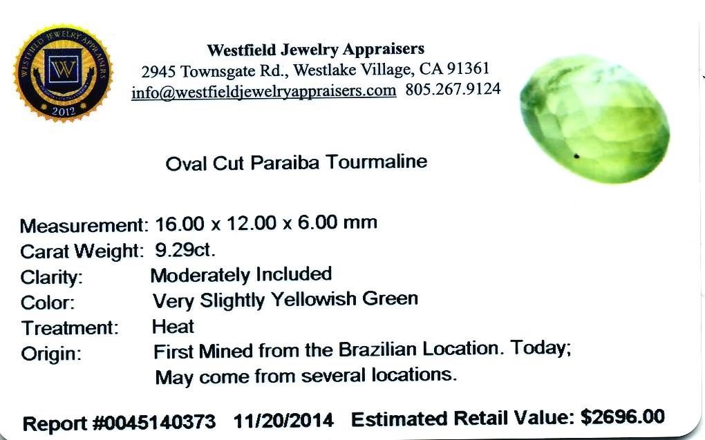 9.29ctw. Oval Cut Paraiba Tourmaline. Westfield Appraised at $2,696.00.