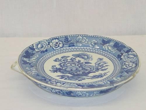 9 3/4" BLUE STAFFORDSHIRE HOT WATER WARMING PLATE - BASKET OF FLOWERS DESIGN - CHIP ON SPIGOT;