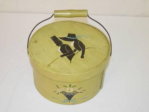 9 3/4" PAINTED ROUND PANTRY BOX W/ BAIL HANDLE-MUSTARD PAINTED W/ COLONY COUPLE ON LID & FLOWERS ON SIDE - PAINT WEAR;
