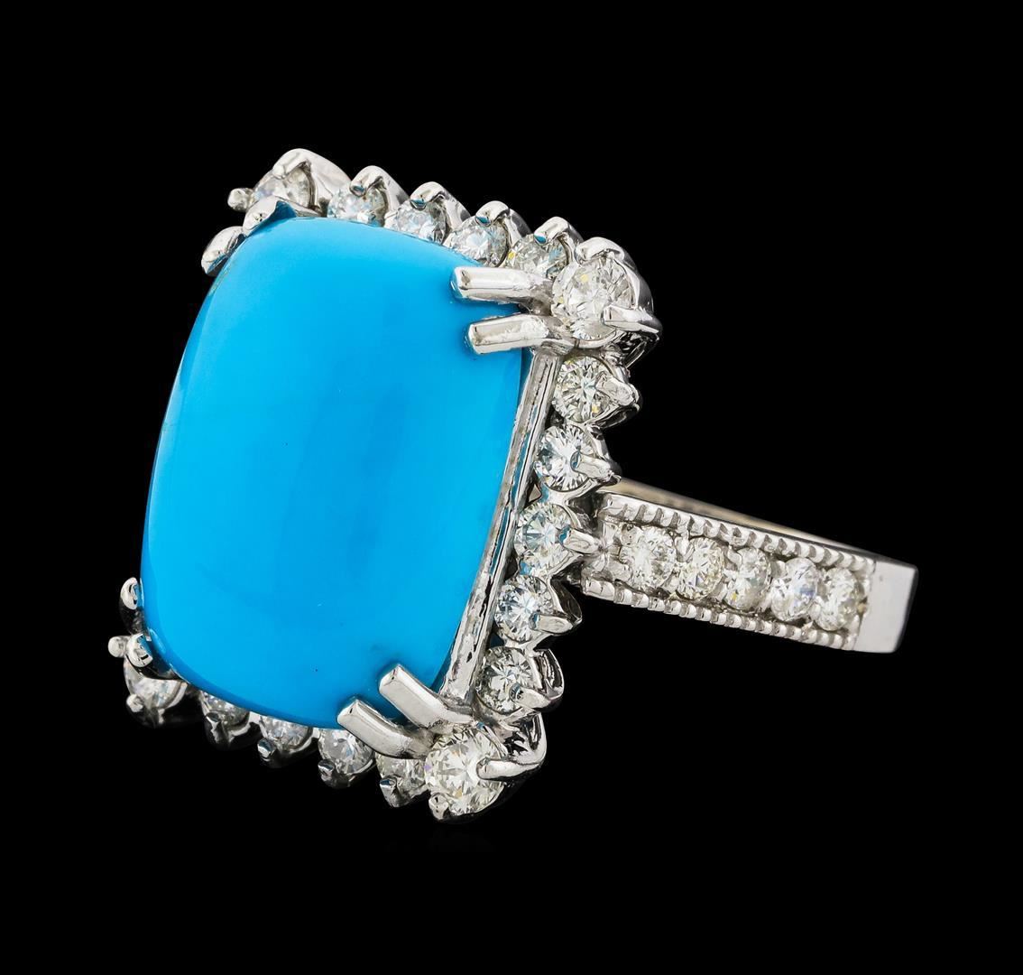 One electronically tested 14KT white gold lady's cast fashion ring with a basket halo with a bright polish with milgrain detailing finish. The featured lady's ring has a shank measuring 2.60 millimeters wide. Identified with markings of '14K'. Condition is new, good workmanship. Containing: One prong set rectangular cushion cabochon standard cut natural turquoise, measuring 15.93 x 11.89 x 5.64mm, (depth est.) approximate weight of 9.30ct., clarity is moderately included, medium, moderately strong, greenish blue color, (GIA gB 5/4), cut is good. Transmitting light diffusely, opaque to translucent. Colored gemstones are presumed to have been subjected to commonly used enhancement processes. Graded in the setting. Four prong set round brilliant cut diamonds, measuring 2.80 - 2.70 x 1.68mm (depth est.) approximate total weight of 4 Stones = 0.31ct. Graded in the setting. Clarity SI-1 to SI-2. Color: H - I Cut Very Good Twenty-Eight prong set round brilliant cut diamonds, measuring 2.15 - 2.00 x 1.27mm (depth est.) approximate total weight of 28 Stones = 0.93ct. Graded in the setting. Clarity SI-1 to I-1. Color: H - I Cut Good. Total Weight of Colored Stones 9.30ct.. Total Weight of Diamonds 1.24ct.. Total Weight of Ring 9.60gm. GAS Appraised.