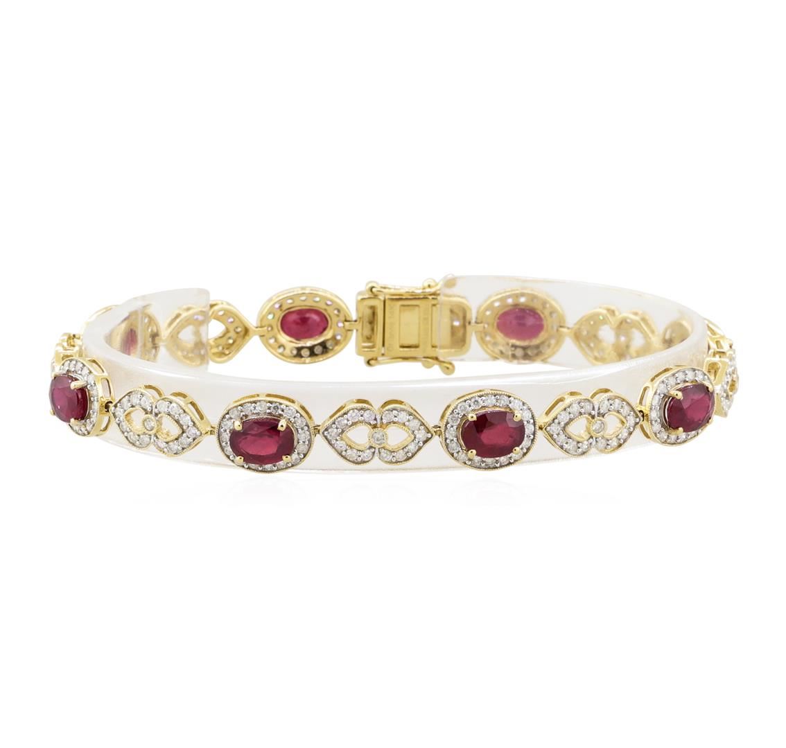 One electronically tested 14KT yellow gold ladies cast & assembled ruby & diamond bracelet. The seven and one quarter inch length bracelet features a series of ruby & diamond bezels, alternating with a smaller series of diamond heart duo links, completed by a concealed clasp, with twin safeties. Each ruby & diamond bezel is framed with milgrain detailing. Bright polish finish with rhodium accents. Identified with markings of "14K". Trademark is Orianne Condition is new, good workmanship. Containing: Eight prong set oval mixed cut natural rubies, measuring 7.00 x 5.00 x 3.25mm, approximate total weight of 9.32ct., clarity is heavily included, type II, dark, very slightly brownish, slightly purplish red color, (GIA slpR 7/3), cut is good. Transmitting light somewhat diffusely, transparent to translucent. Naturally occurring internal & external characteristics are present. Indications of laboratory high temperature heat treatment, with glass & flux additives. Graded in the setting. Ruby has a low tolerance to rhodium plating, repolishing the surface, & ultrasonic cleaning. Two Hundred Forty-Eight prong & bezel set round brilliant cut diamonds approximate total weight of 248 Stones = 2.33ct. Graded in the setting. Clarity SI-2 to I-2 Color G - H Total Weight of Colored Stones 9.32 ct. Total Weight of Diamonds 2.33 ct. Total Weight of Bracelet 14.20 gm Estimated Retail Value $ 10,400.00 US