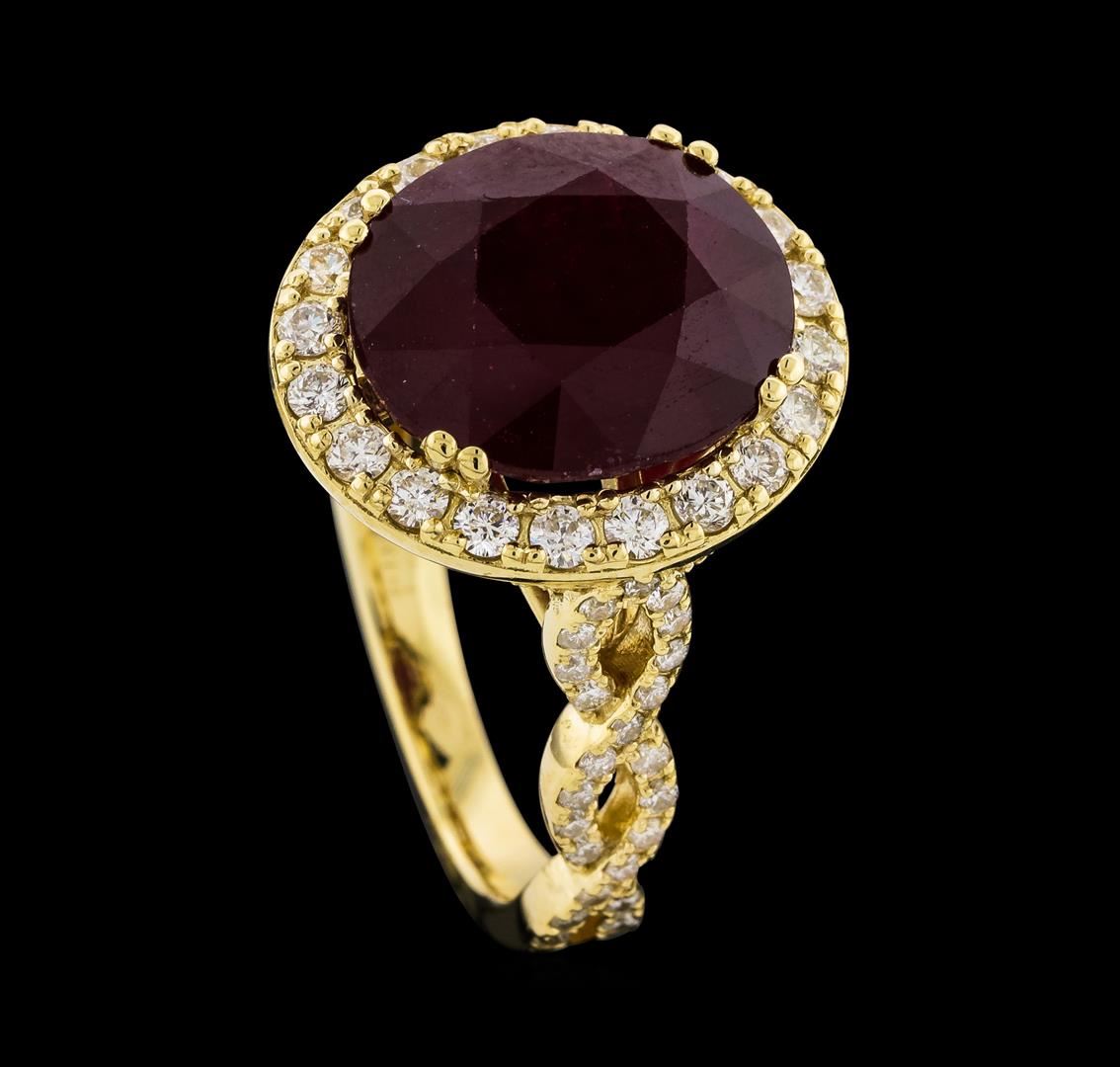 One electronically tested 14KT yellow gold lady's cast fashion ring with a twisted split shank with a bright polish finish. The featured lady's ring has a cathedral halo and a shank measuring 2.58 millimeters wide. Identified with markings of 'K14'. Condition is new, good workmanship. Containing: One prong set oval modified brilliant cut natural ruby, measuring 13.04 x 11.38 x 6.95mm, (depth est.) 8%. bulge factor, approximate weight of 9.32ct., clarity is heavily included, dark, very slightly brownish, red color, (GIA R 7/3), cut is very good. Transmitting light somewhat diffusely, semi-transparent to translucent. Naturally occurring internal & external characteristics are present. Indications of laboratory high temperature heat treatment, with glass & flux additives. Colored gemstones are presumed to have been subjected to commonly used enhancement processes. Graded in the setting. Twenty prong set round brilliant cut diamonds, measuring 1.90 - 1.85 x 1.17mm (depth est.) approximate total weight of 20 Stones = 0.51ct. Graded in the setting. Clarity SI-1 to I-1. Color: G - H Cut Good Seventy-Six prong set round brilliant cut diamonds, measuring 1.30 - 1.15 x 0.76mm (depth est.) approximate total weight of 76 Stones = 0.53ct. Graded in the setting. Clarity SI-1 to I-1. Color: G - I Cut Good. Total Weight of Colored Stones 9.32ct.. Total Weight of Diamonds 1.04ct.. Total Weight of Ring 7.80gm. GAS Appraised at $6,835.00.