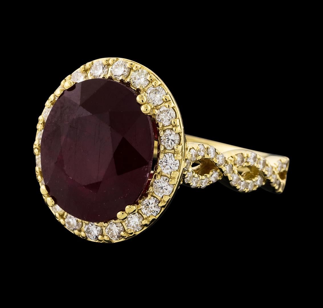 One electronically tested 14KT yellow gold lady's cast fashion ring with a twisted split shank with a bright polish finish. The featured lady's ring has a cathedral halo and a shank measuring 2.58 millimeters wide. Identified with markings of 'K14'. Condition is new, good workmanship. Containing: One prong set oval modified brilliant cut natural ruby, measuring 13.04 x 11.38 x 6.95mm, (depth est.) 8%. bulge factor, approximate weight of 9.32ct., clarity is heavily included, dark, very slightly brownish, red color, (GIA R 7/3), cut is very good. Transmitting light somewhat diffusely, semi-transparent to translucent. Naturally occurring internal & external characteristics are present. Indications of laboratory high temperature heat treatment, with glass & flux additives. Colored gemstones are presumed to have been subjected to commonly used enhancement processes. Graded in the setting. Twenty prong set round brilliant cut diamonds, measuring 1.90 - 1.85 x 1.17mm (depth est.) approximate total weight of 20 Stones = 0.51ct. Graded in the setting. Clarity SI-1 to I-1. Color: G - H Cut Good Seventy-Six prong set round brilliant cut diamonds, measuring 1.30 - 1.15 x 0.76mm (depth est.) approximate total weight of 76 Stones = 0.53ct. Graded in the setting. Clarity SI-1 to I-1. Color: G - I Cut Good. Total Weight of Colored Stones 9.32ct.. Total Weight of Diamonds 1.04ct.. Total Weight of Ring 7.80gm. GAS Appraised at $6,835.00.