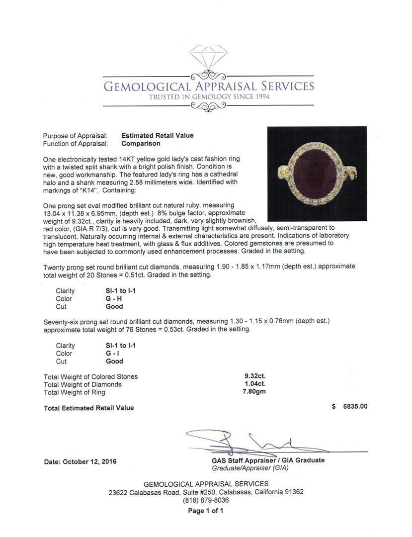 One electronically tested 14KT yellow gold lady's cast fashion ring with a twisted split shank with a bright polish finish. The featured lady's ring has a cathedral halo and a shank measuring 2.58 millimeters wide. Identified with markings of 'K14'. Condition is new, good workmanship. Containing: One prong set oval modified brilliant cut natural ruby, measuring 13.04 x 11.38 x 6.95mm, (depth est.) 8%. bulge factor, approximate weight of 9.32ct., clarity is heavily included, dark, very slightly brownish, red color, (GIA R 7/3), cut is very good. Transmitting light somewhat diffusely, semi-transparent to translucent. Naturally occurring internal & external characteristics are present. Indications of laboratory high temperature heat treatment, with glass & flux additives. Colored gemstones are presumed to have been subjected to commonly used enhancement processes. Graded in the setting. Twenty prong set round brilliant cut diamonds, measuring 1.90 - 1.85 x 1.17mm (depth est.) approximate total weight of 20 Stones = 0.51ct. Graded in the setting. Clarity SI-1 to I-1. Color: G - H Cut Good Seventy-Six prong set round brilliant cut diamonds, measuring 1.30 - 1.15 x 0.76mm (depth est.) approximate total weight of 76 Stones = 0.53ct. Graded in the setting. Clarity SI-1 to I-1. Color: G - I Cut Good. Total Weight of Colored Stones 9.32ct.. Total Weight of Diamonds 1.04ct.. Total Weight of Ring 7.80gm. GAS Appraised at $6,835.00.
