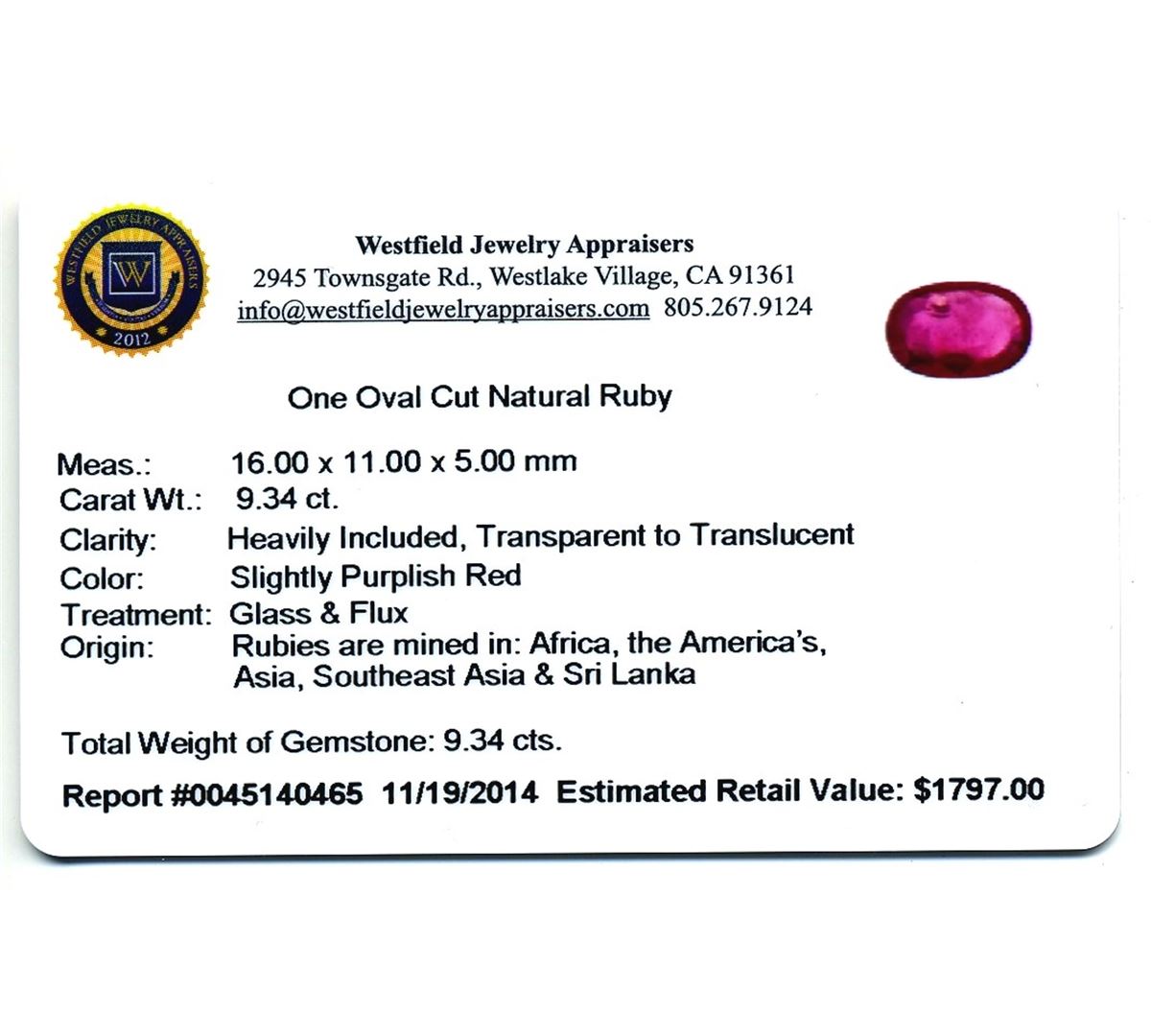 9.34ct. One Oval Cut Natural Ruby Westfield Appraised at $1,797.00.