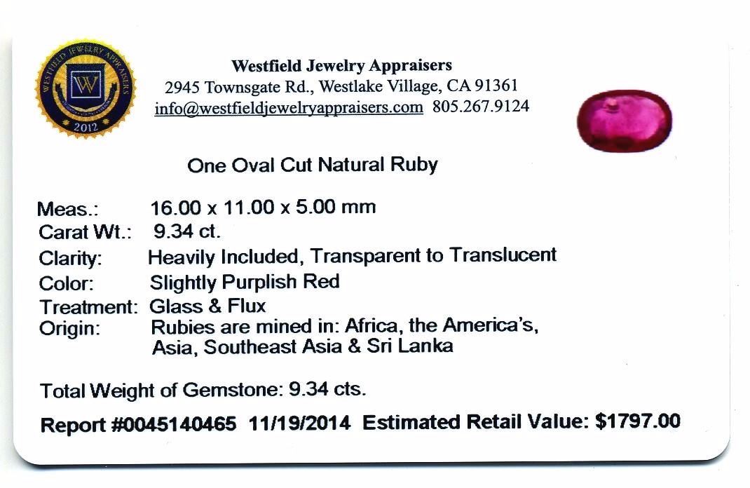 9.34ct. One Oval Cut Natural Ruby Westfield Appraised at $1,797.00.