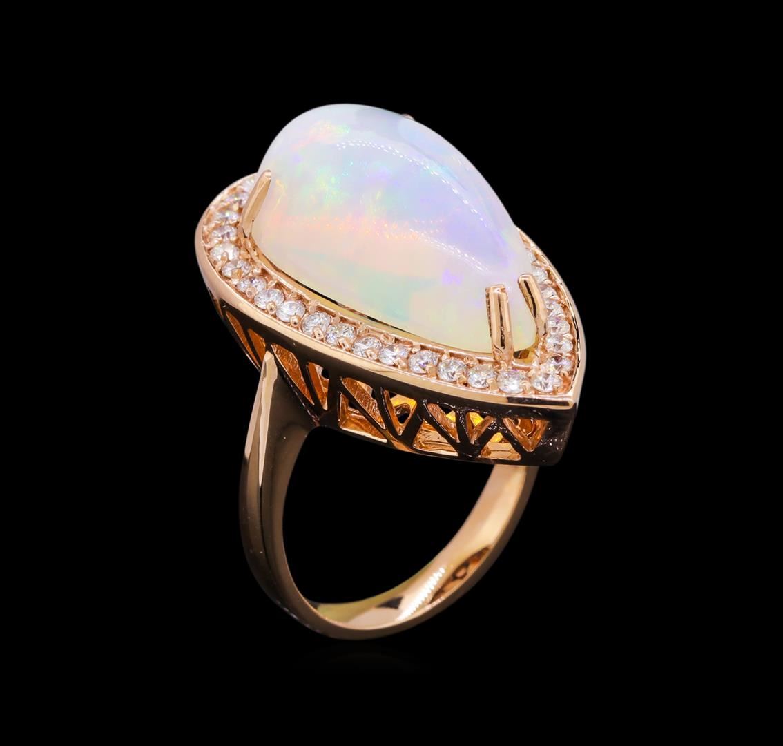 One electronically tested 14KT rose gold lady's cast fashion ring with a basket halo with a bright polish finish. The featured lady's ring has a shank measuring 3.03 millimeters in width. Identified with markings of "14K". Condition is new, good workmanship. Containing: One crystal opal that is cut in a pear shaped cabochon and is prong set, measuring 22.17 mm long x 12.40 mm wide, and 6.70 mm thick and the approximate weight is 9.35 carats. The opal has a bright, multicolor play of color (fire) in a rolling flashfire pattern; a medium dome; a good cut; no inclusions in its brightness and pattern; and is. Transmitting light somewhat diffusely, transparent to translucent. Graded in the setting. Thirty-Five prong set round brilliant cut diamonds, measuring 1.80 - 1.75 x 1.10mm (depth est.) approximate total weight of 35 Stones = 0.68ct. Graded in the setting. Clarity: SI-1 to SI-2. Color: H - I. Cut Good. Total Weight of Diamonds 0.68ct. Total Weight of Opals 9.35ct. Total Weight of Ring 11.60gm. GAS Appraised at $7,035.00.