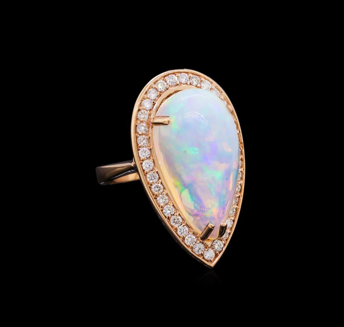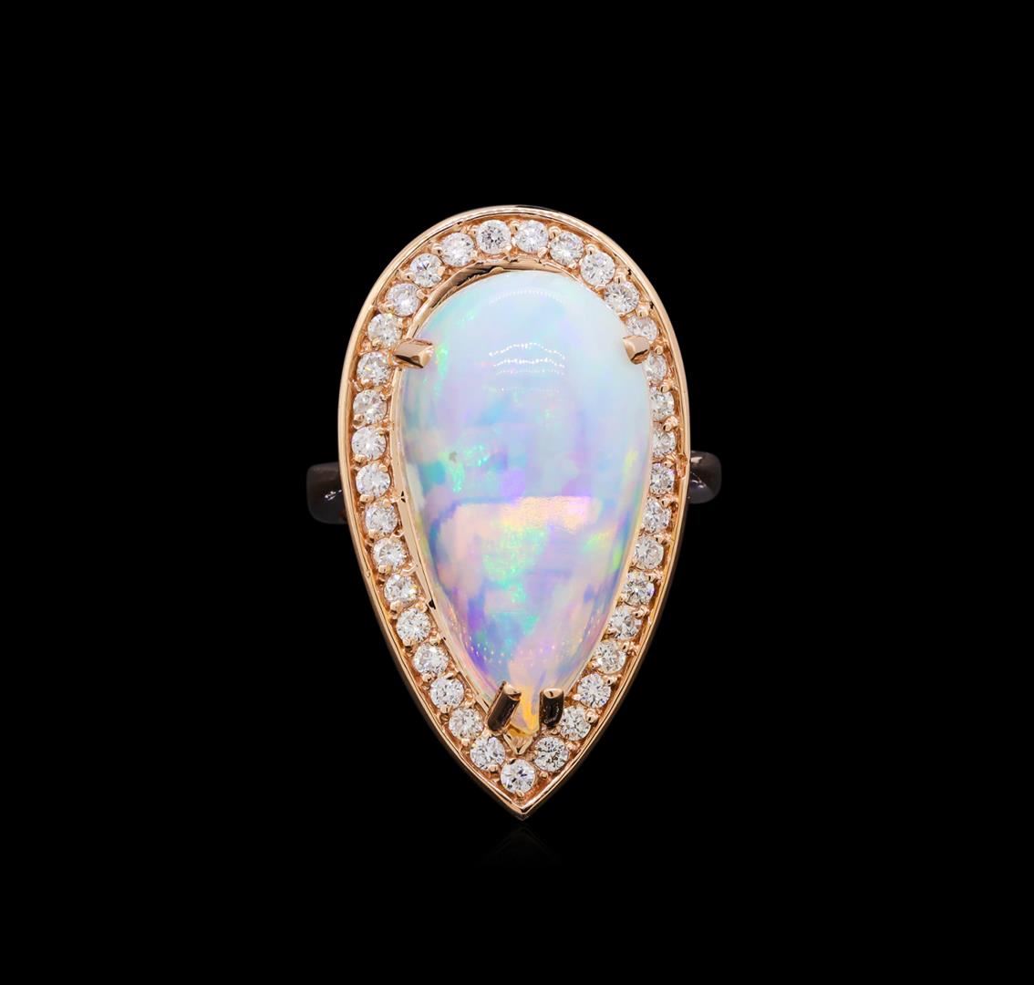 One electronically tested 14KT rose gold lady's cast fashion ring with a basket halo with a bright polish finish. The featured lady's ring has a shank measuring 3.03 millimeters in width. Identified with markings of "14K". Condition is new, good workmanship. Containing: One crystal opal that is cut in a pear shaped cabochon and is prong set, measuring 22.17 mm long x 12.40 mm wide, and 6.70 mm thick and the approximate weight is 9.35 carats. The opal has a bright, multicolor play of color (fire) in a rolling flashfire pattern; a medium dome; a good cut; no inclusions in its brightness and pattern; and is. Transmitting light somewhat diffusely, transparent to translucent. Graded in the setting. Thirty-Five prong set round brilliant cut diamonds, measuring 1.80 - 1.75 x 1.10mm (depth est.) approximate total weight of 35 Stones = 0.68ct. Graded in the setting. Clarity: SI-1 to SI-2. Color: H - I. Cut Good. Total Weight of Diamonds 0.68ct. Total Weight of Opals 9.35ct. Total Weight of Ring 11.60gm. GAS Appraised at $7,035.00.