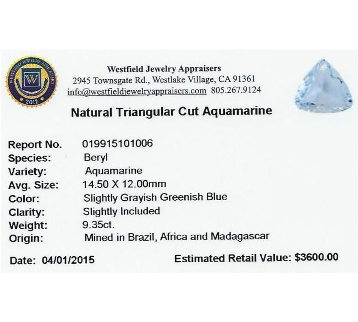 One triangle mixed cut natural aquamarine exact weight 9.35ct., clarity is slightly included, type I, medium, slightly grayish, very slightly greenish blue color, (GIA vslgB 5/2), cut is good. Westfield Appraised at $3,600.00.