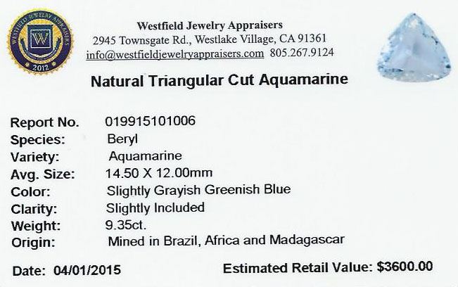One triangle mixed cut natural aquamarine exact weight 9.35ct., clarity is slightly included, type I, medium, slightly grayish, very slightly greenish blue color, (GIA vslgB 5/2), cut is good. Westfield Appraised at $3,600.00.
