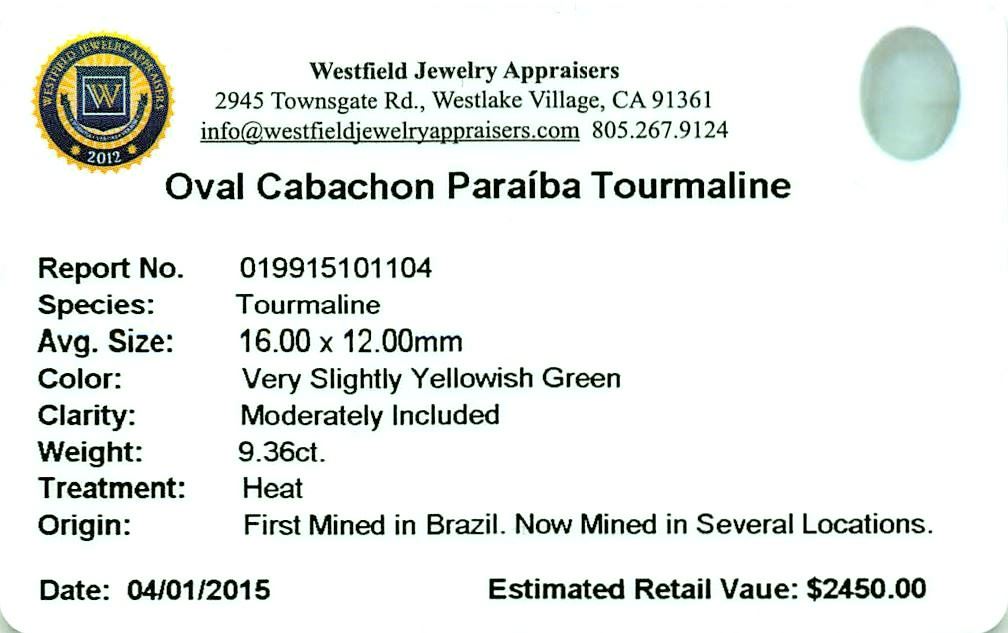 One oval cabochon cut natural Paraiba tourmaline exact weight 9.36ct., clarity is moderately included, cut is good. Westfield Appraised at $2,450.00.