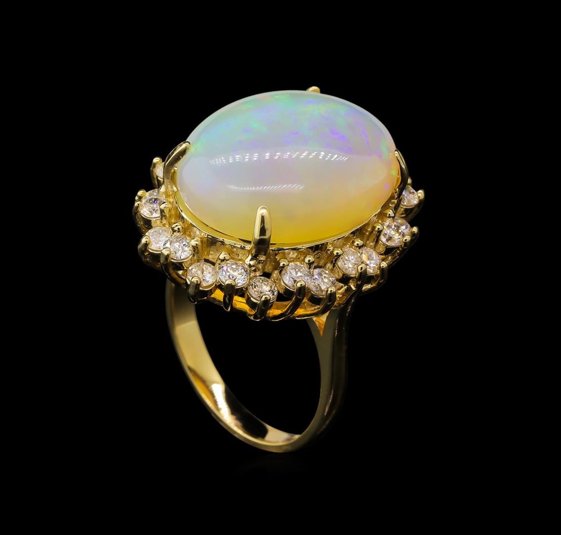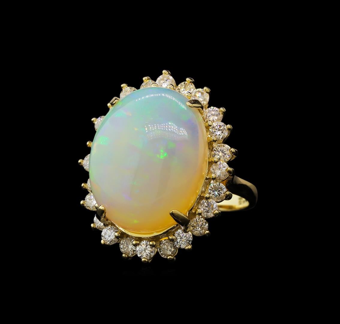 One electronically tested 14KT yellow gold lady's cast fashion ring with a basket halo with a bright polish finish. The featured lady's ring has a shank measuring 2.49 millimeters wide. Identified with markings of 'K14'. Condition is new, good workmanship. Containing: One crystal opal that is cut in a oval shaped cabochon and is prong set, measuring 18.03 mm long x 14.52 mm wide, and 6.98 mm thick and the approximate weight is 9.37 carats. The opal has a somewhat bright, multicolor play of color (fire) in a rolling flashfire pattern; a medium dome; a good cut; no inclusions; minor dull spot in its brightness and pattern; and is not directional. Graded in the setting. Twenty-Four prong set round brilliant cut diamonds, measuring 2.40 - 2.30 x 1.46mm (depth est.) approximate total weight of 24 Stones = 1.18ct. Graded in the setting. Clarity SI-1 to I-1. Color: H - I Cut Good. Total Weight of Diamonds 1.18ct.. Total Weight of Opals 9.37ct.. Total Weight of Ring 8.10gm GAS Appraised at $6,720.00.
