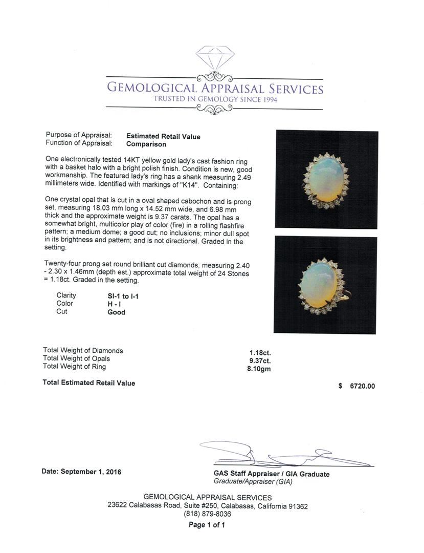 One electronically tested 14KT yellow gold lady's cast fashion ring with a basket halo with a bright polish finish. The featured lady's ring has a shank measuring 2.49 millimeters wide. Identified with markings of 'K14'. Condition is new, good workmanship. Containing: One crystal opal that is cut in a oval shaped cabochon and is prong set, measuring 18.03 mm long x 14.52 mm wide, and 6.98 mm thick and the approximate weight is 9.37 carats. The opal has a somewhat bright, multicolor play of color (fire) in a rolling flashfire pattern; a medium dome; a good cut; no inclusions; minor dull spot in its brightness and pattern; and is not directional. Graded in the setting. Twenty-Four prong set round brilliant cut diamonds, measuring 2.40 - 2.30 x 1.46mm (depth est.) approximate total weight of 24 Stones = 1.18ct. Graded in the setting. Clarity SI-1 to I-1. Color: H - I Cut Good. Total Weight of Diamonds 1.18ct.. Total Weight of Opals 9.37ct.. Total Weight of Ring 8.10gm GAS Appraised at $6,720.00.