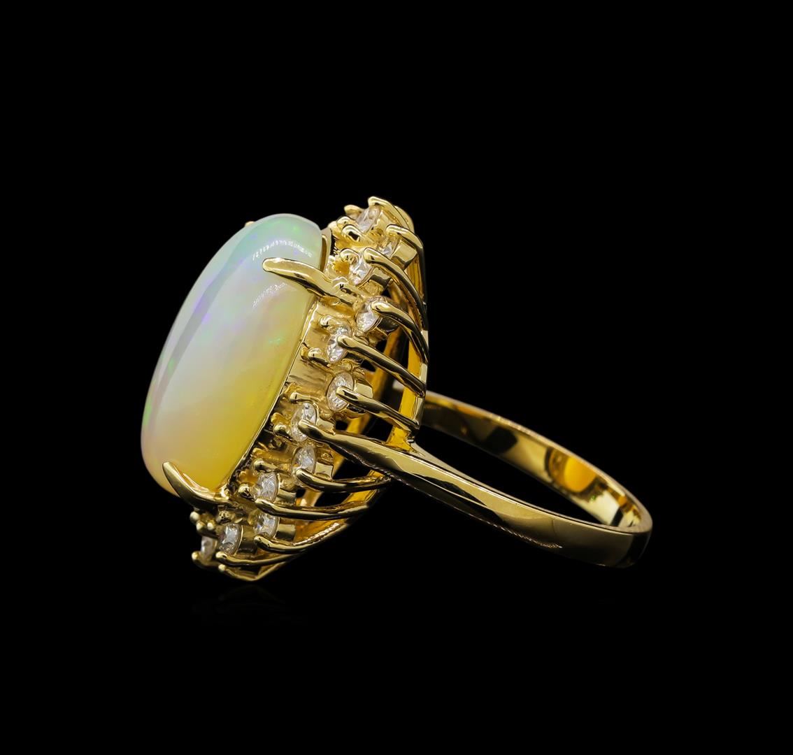One electronically tested 14KT yellow gold lady's cast fashion ring with a basket halo with a bright polish finish. The featured lady's ring has a shank measuring 2.49 millimeters wide. Identified with markings of 'K14'. Condition is new, good workmanship. Containing: One crystal opal that is cut in a oval shaped cabochon and is prong set, measuring 18.03 mm long x 14.52 mm wide, and 6.98 mm thick and the approximate weight is 9.37 carats. The opal has a somewhat bright, multicolor play of color (fire) in a rolling flashfire pattern; a medium dome; a good cut; no inclusions; minor dull spot in its brightness and pattern; and is not directional. Graded in the setting. Twenty-Four prong set round brilliant cut diamonds, measuring 2.40 - 2.30 x 1.46mm (depth est.) approximate total weight of 24 Stones = 1.18ct. Graded in the setting. Clarity SI-1 to I-1. Color: H - I Cut Good. Total Weight of Diamonds 1.18ct.. Total Weight of Opals 9.37ct.. Total Weight of Ring 8.10gm GAS Appraised at $6,720.00.
