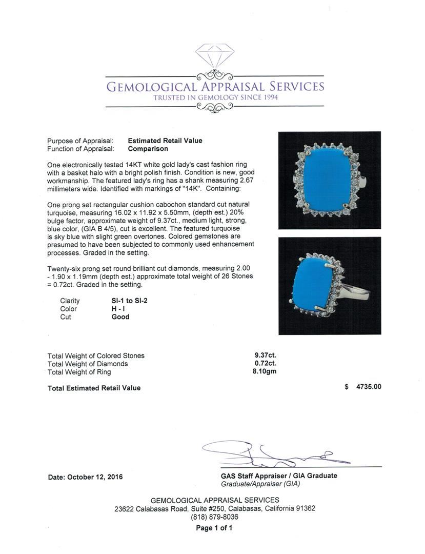 One electronically tested 14KT white gold lady's cast fashion ring with a basket halo with a bright polish finish. The featured lady's ring has a shank measuring 2.67 millimeters wide. Identified with markings of '14K'. Condition is new, good workmanship. Containing: One prong set rectangular cushion cabochon standard cut natural turquoise, measuring 16.02 x 11.92 x 5.50mm, (depth est.) 20%. bulge factor, approximate weight of 9.37ct., medium light, strong, blue color, (GIA B 4/5), cut is excellent. The featured turquoise is sky blue with slight green overtones. Colored gemstones are presumed to have been subjected to commonly used enhancement processes. Graded in the setting. Twenty-Six prong set round brilliant cut diamonds, measuring 2.00 - 1.90 x 1.19mm (depth est.) approximate total weight of 26 Stones = 0.72ct. Graded in the setting. Clarity SI-1 to SI-2. Color: H - I Cut Good. Total Weight of Colored Stones 9.37ct.. Total Weight of Diamonds 0.72ct.. Total Weight of Ring 8.10gm. GAS Appraised at $4,735.00.
