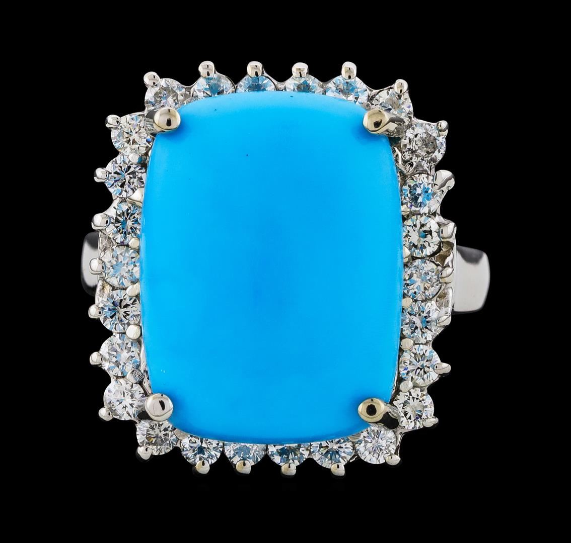One electronically tested 14KT white gold lady's cast fashion ring with a basket halo with a bright polish finish. The featured lady's ring has a shank measuring 2.67 millimeters wide. Identified with markings of '14K'. Condition is new, good workmanship. Containing: One prong set rectangular cushion cabochon standard cut natural turquoise, measuring 16.02 x 11.92 x 5.50mm, (depth est.) 20%. bulge factor, approximate weight of 9.37ct., medium light, strong, blue color, (GIA B 4/5), cut is excellent. The featured turquoise is sky blue with slight green overtones. Colored gemstones are presumed to have been subjected to commonly used enhancement processes. Graded in the setting. Twenty-Six prong set round brilliant cut diamonds, measuring 2.00 - 1.90 x 1.19mm (depth est.) approximate total weight of 26 Stones = 0.72ct. Graded in the setting. Clarity SI-1 to SI-2. Color: H - I Cut Good. Total Weight of Colored Stones 9.37ct.. Total Weight of Diamonds 0.72ct.. Total Weight of Ring 8.10gm. GAS Appraised at $4,735.00.