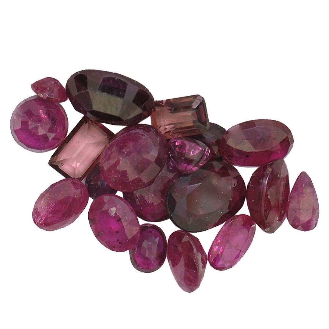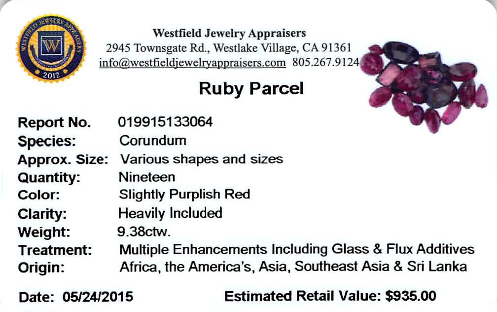 Nineteen various shapes & sizes cut natural rubies exact total weight 9.38ct., clarity is heavily included, type II, dark, very slightly brownish, slightly purplish red color, (GIA slpR 7/3), cut is good. Transmitting light somewhat diffusely, transparent to translucent. Naturally occurring internal & external characteristics are present. Indications of laboratory high temperature heat treatment, with glass & flux additives. Ruby has a low tolerance to rhodium plating, repolishing the surface, & ultrasonic cleaning. Westfield Appraised at $935.00.