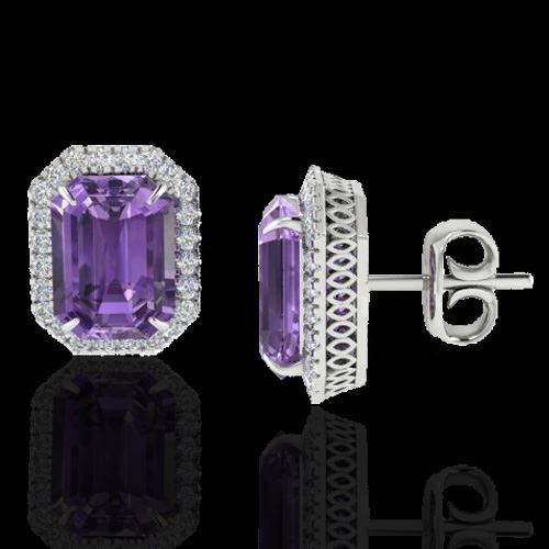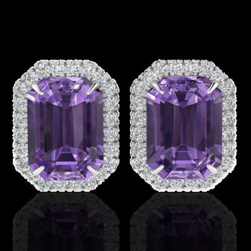 REF-77W8F -21216 ---- 9.40 CTW Amethyst & Micro Pave VS/SI Diamond Halo Earrings 18K White Gold ---- Luxury Designer Brand Earring Appraised at $5,550 Certificate Number US21216 18k White gold, Earring Size is 1/2 Inches, Earring measuring approx. 1/2" X 1/2" , weighing in total approx. 5 grams. Made in the USA and is stamped 18k, Main stone 9 carat total weight containing 2 pieces of Intense Translucent Purple color with AAA quality Emerald shape cut Amethyst , Stone #2 0.4 carat total weight containing 50 pieces of H-I color with VS/SI quality Round shape cut Diamond