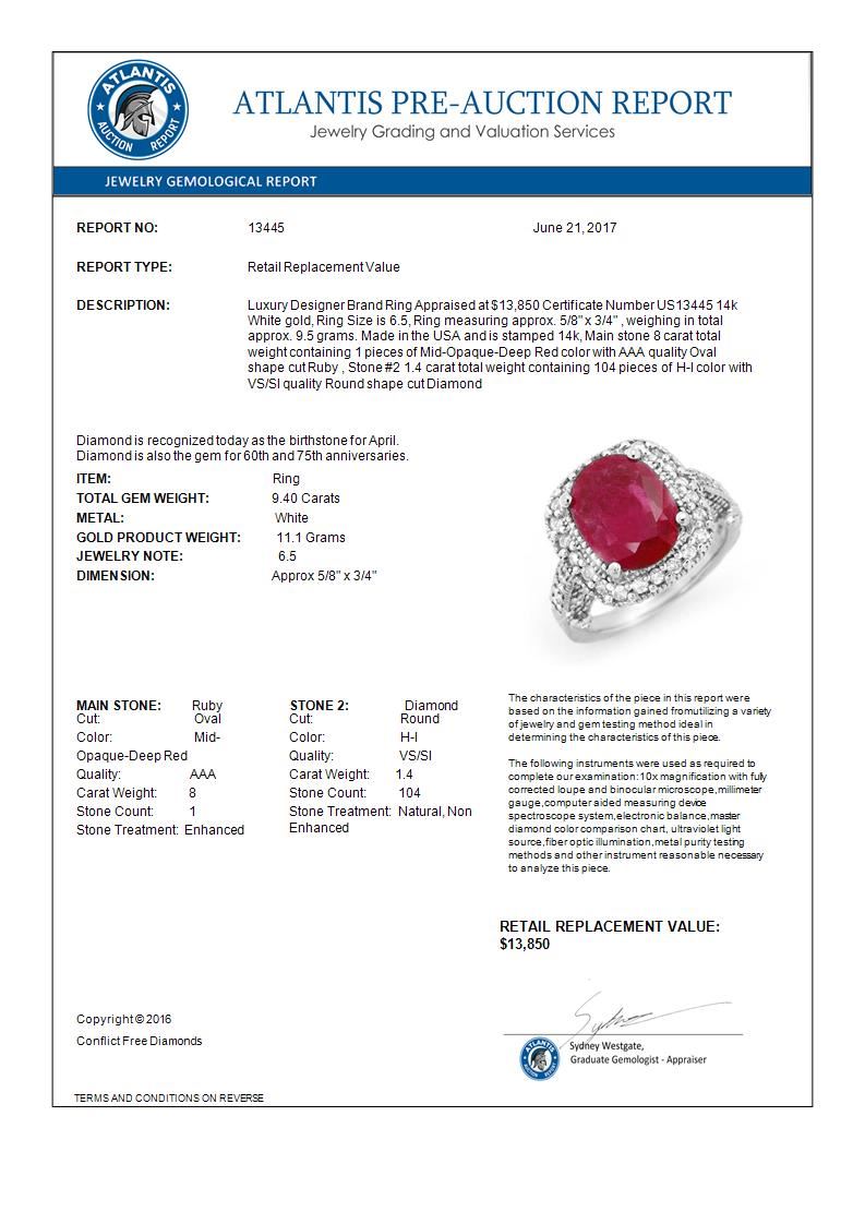 9.40 CTW Ruby & Diamond Ring 14K White Gold ---- Luxury Designer Brand Ring Appraised Retail Price at $13,850 ---- SKU Number US13445 14k White gold Ring Size is 6.5, Ring measuring approx. 5/8" x 3/4" , weighing in total approx. 9.5 grams. Made in the USA and is stamped 14k, Main stone 8 carat total weight containing 1 pieces of Mid-Opaque-Deep Red color with AAA quality Oval shape cut Ruby , Stone #2 1.4 carat total weight containing 104 pieces of H-I color with VS/SI quality Round shape cut