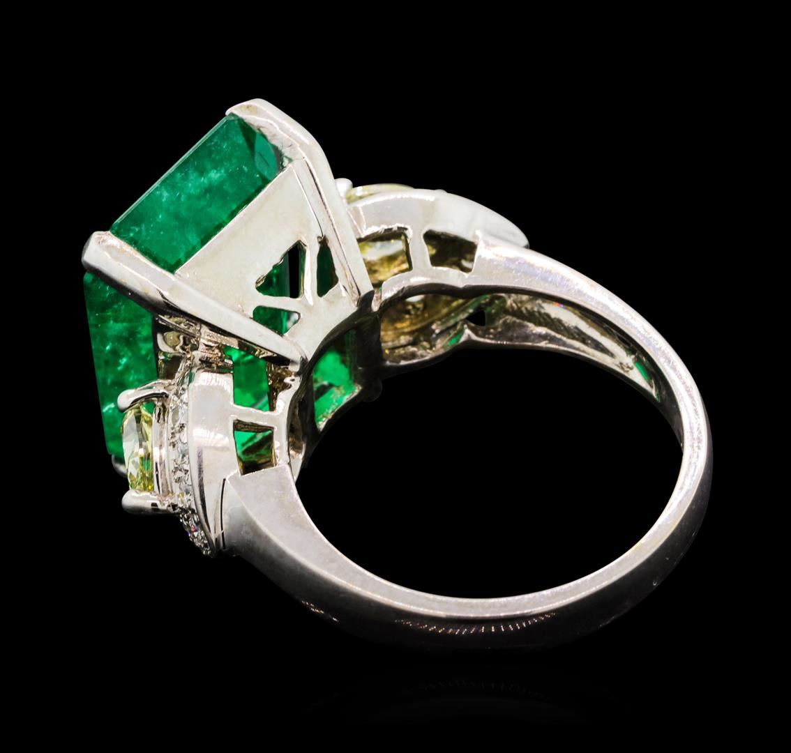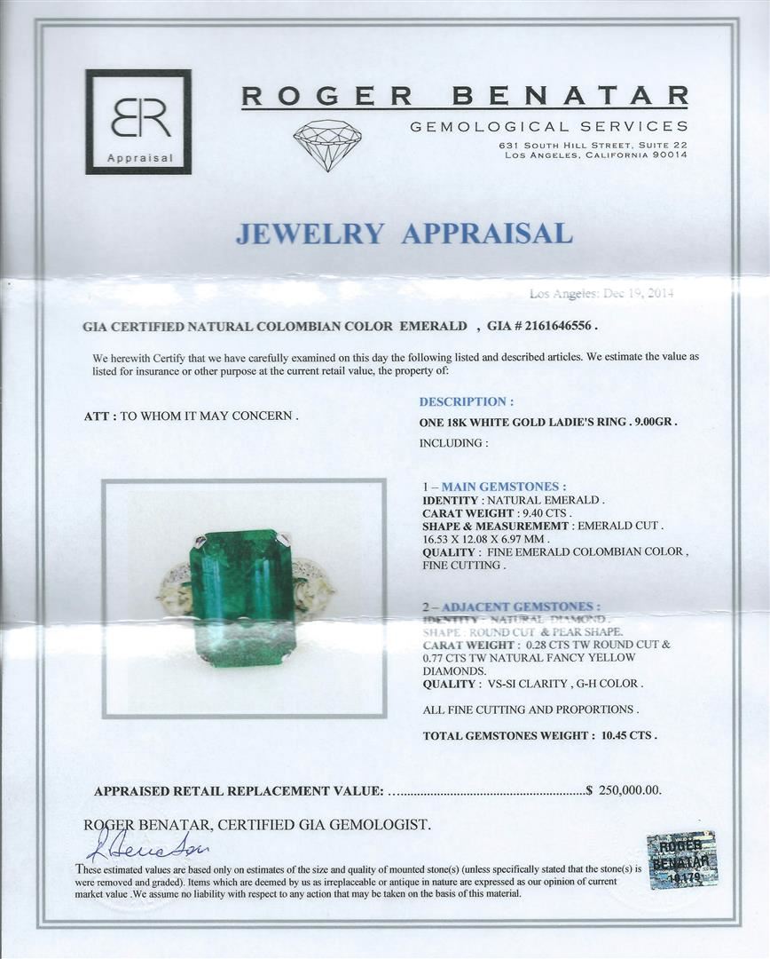 One electronically tested 18KT whit gold ladie's ring 9.00 grams including one natural emerald weighing 9.40cts and side diamonds weighing 1.05cts. Fine cutting and proportions. RBGS Appraised at $250,000.00.