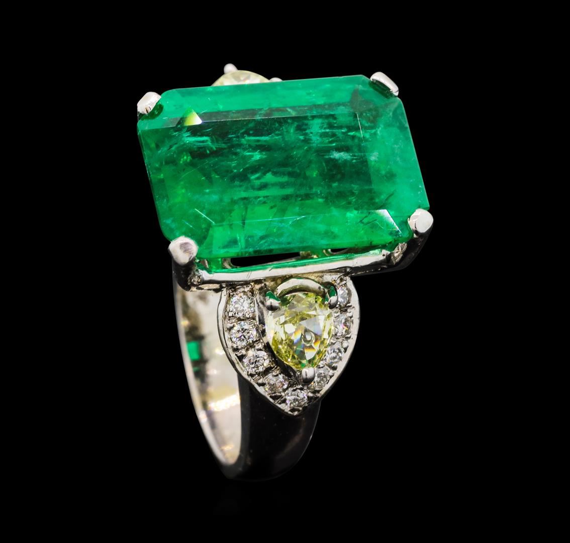 One electronically tested 18KT whit gold ladie's ring 9.00 grams including one natural emerald weighing 9.40cts and side diamonds weighing 1.05cts. Fine cutting and proportions. RBGS Appraised at $250,000.00.