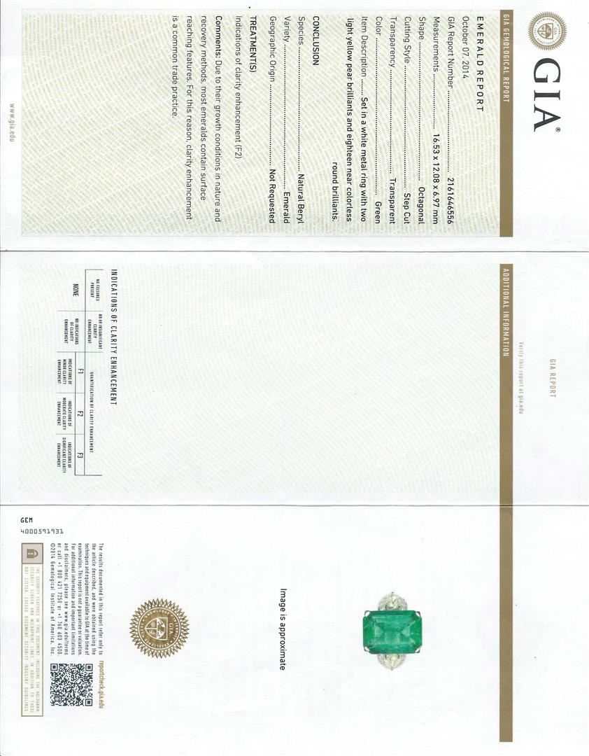 One electronically tested 18KT whit gold ladie's ring 9.00 grams including one natural emerald weighing 9.40cts and side diamonds weighing 1.05cts. Fine cutting and proportions. RBGS Appraised at $250,000.00.